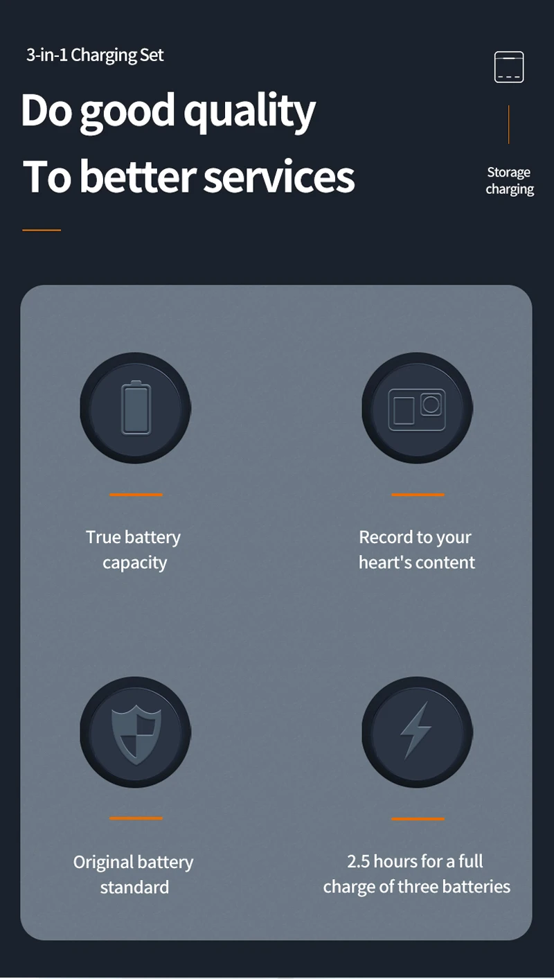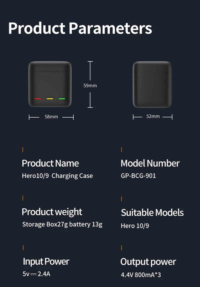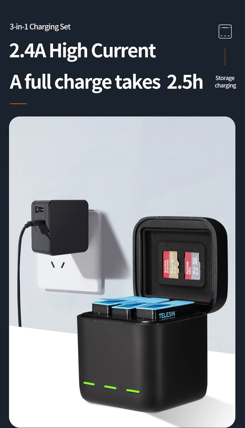 -Приятная для кожи текстура, олеофобное покрытие-Можно хранить две карты памяти одновременно-Маленький размер, легко помещается в рюкзак-Быстрая зарядка, 2,5 H полной зарядки-Можно заряжать три аккумулятора одновременно, останавливаться при полном заряде