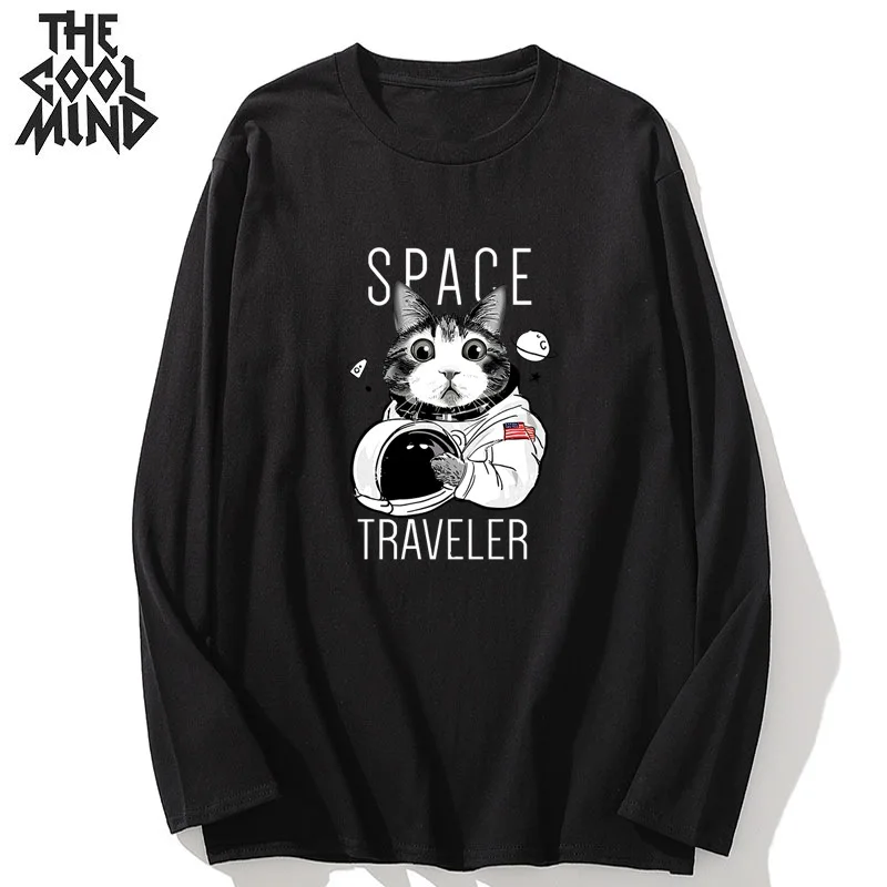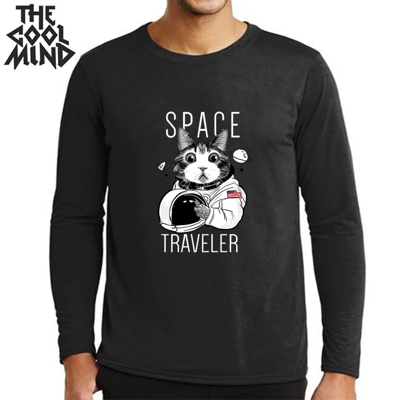 Мужская футболка COOLMIND из 100% хлопка с длинным рукавом и принтом космического кота, повседневная мужская футболка с круглым вырезом, свободная футболка
