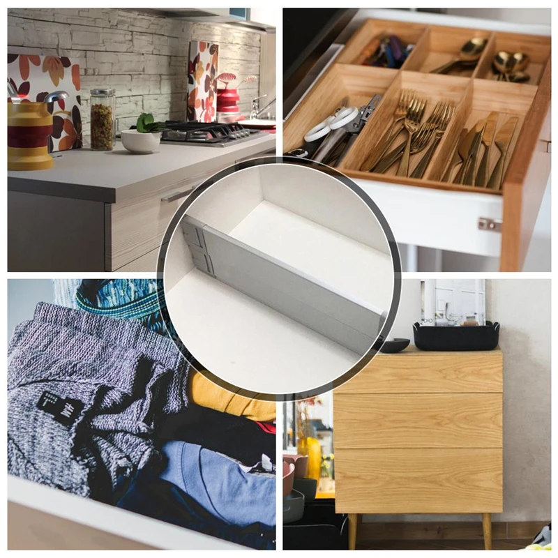 1. Материал: изготовлен из АБС-материала, он прочно закреплен на месте, пенопласт заземлен.2. Регулируемые разделители для ящиков-органайзеров мгновенно разгадывают и организуют кухонные ящики, ванну и туалет без необходимости в инструментах. Он прост в установке и может быть адаптирован к большинству ящиков.3. Уникальный дизайн позволяет легко установить, нет необходимости в инструментах, и его можно закрепить нажатием кнопки. Резиновая прокладка в конце каждого сепаратора защищает ящик.4. Может также использоваться в отделочных машинах для ящиков, перегородках шкафа, перегородках для настольных ящиков, отделителях ящиков, одежде, нижнее белье, носках5. Различные спецификации для разных размеров ящиков.