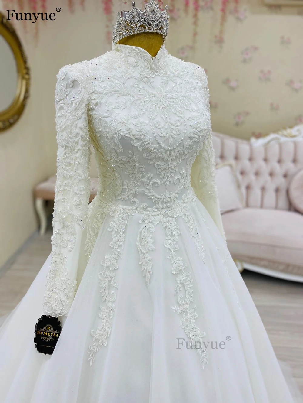Женское свадебное платье, кружевное бальное платье цвета слоновой кости, с длинными рукавами, из тюля, мусульманский с высокой шеей
