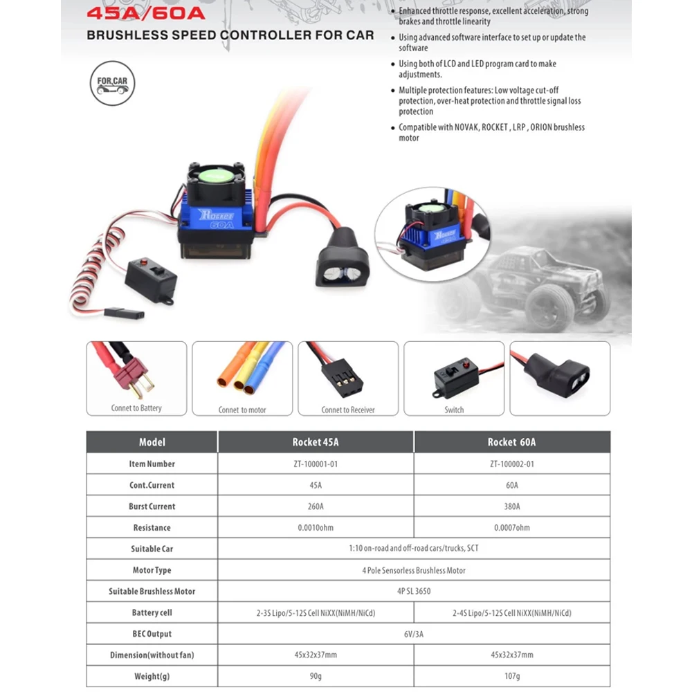 Щетки Surpass Hobby Rocket 45A ESC, электрический регулятор скорости, водонепроницаемый для радиоуправляемого автомобиля 110 112, Traxxas, гусеничный двигатель 3650 F540