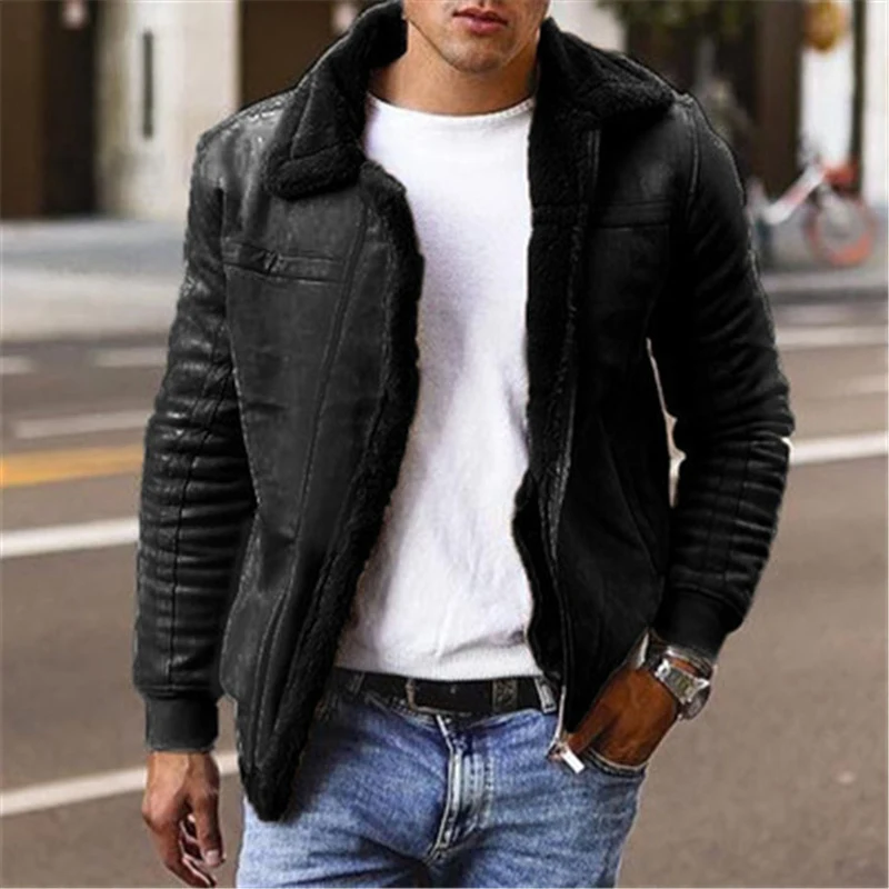 Мужская куртка из искусственной кожи, зимняя теплая куртка с отворо...
