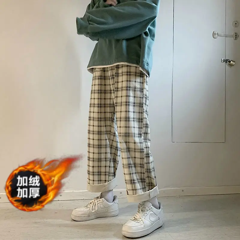 Женские брюки в клетку, осенне-зимние тренировочные брюки, теплые прямые брюки с широкими штанинами, Женские флисовые повседневные брюки с эластичным поясом