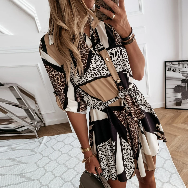 Женское осеннее леопардовое платье-рубашка с длинным рукавом и отложным воротником, мини-платье с поясом, офисное Сексуальное Женское Платье на одной пуговице, платья
