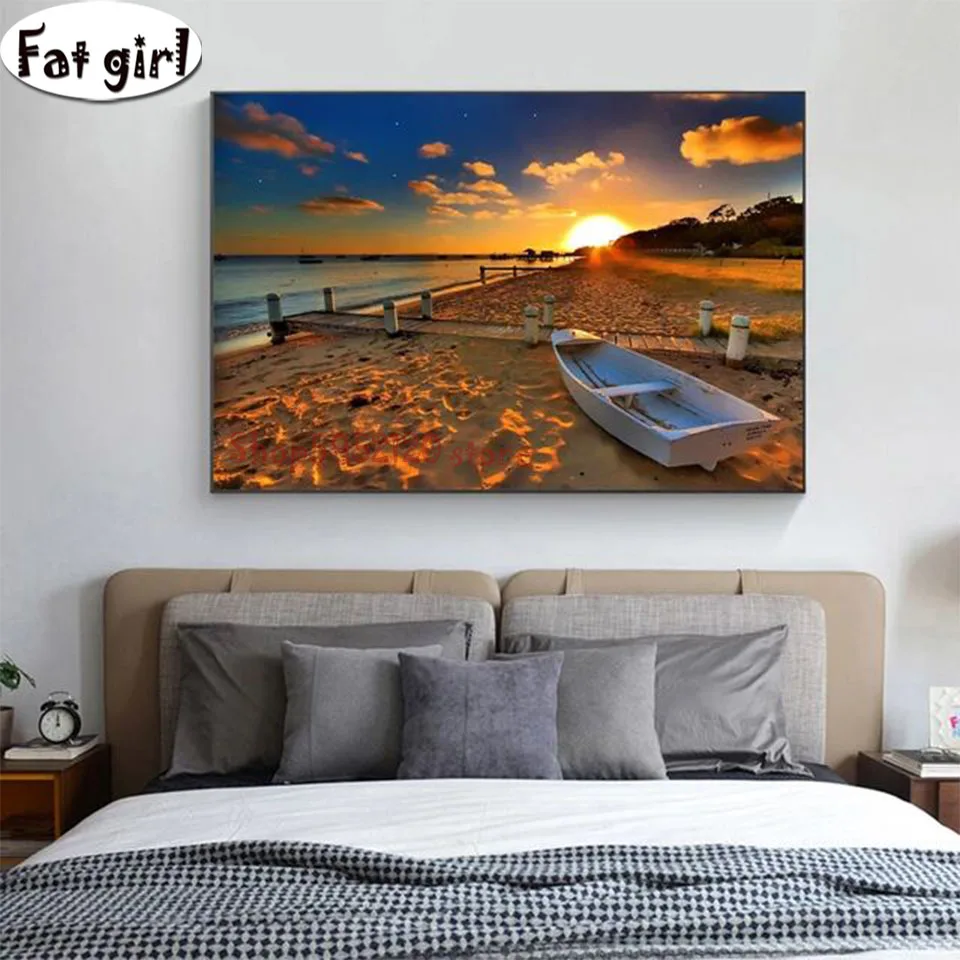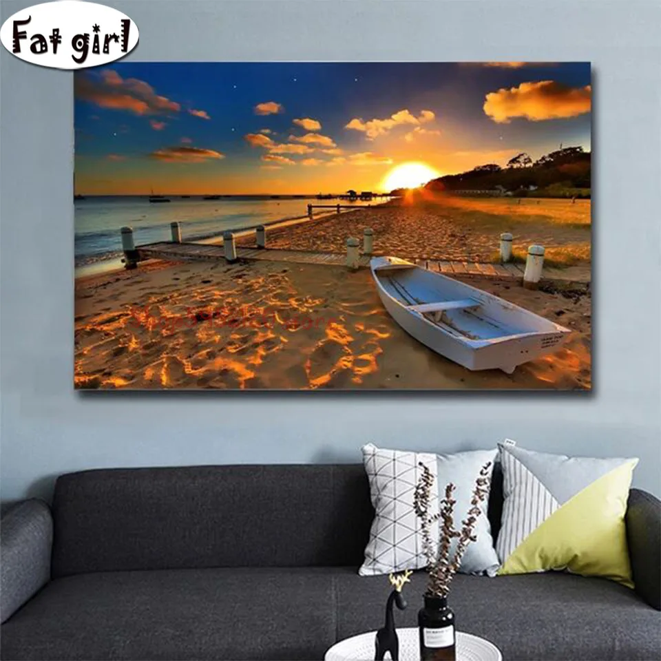 5D алмазная живопись, пляжный закат, пейзаж, сделай сам, вышивка, полностью квадратный, Круглый, ручная работа, хобби, деревянная лодка, ландшафт, Декор без рамки