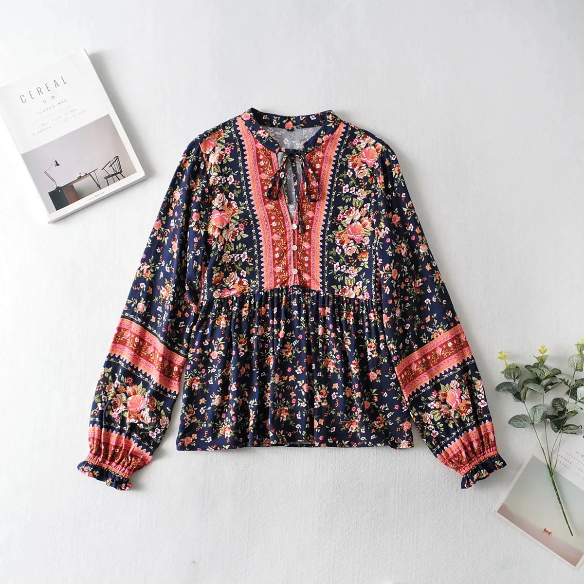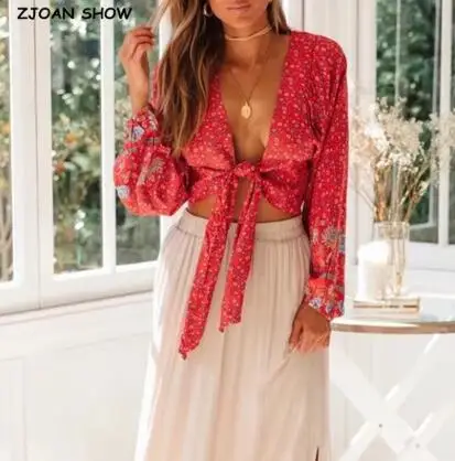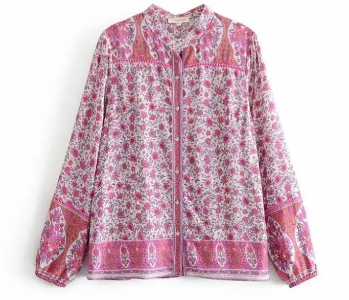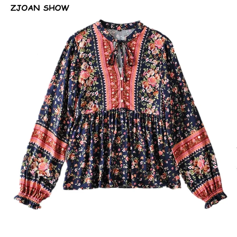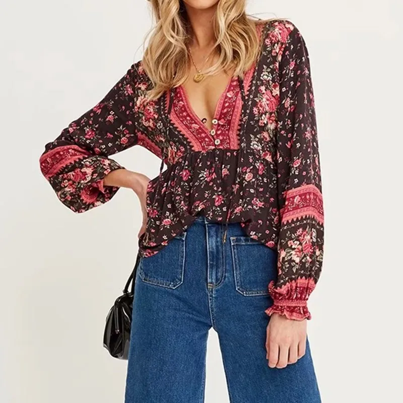 В богемном стиле повязки Открытые Кнопки V образным вырезом Цветочный принт Женская рубашка для отдыха контрастного цвета свободные Блузка с длинными рукавами Топы пляжные 1 комплект