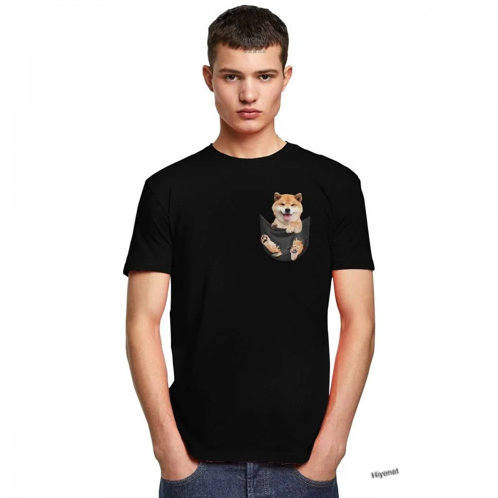 Забавная Милая футболка с изображением Сиба-ину, щенка, имитация кармана, Мужская забавная футболка с короткими рукавами и японской собакой, футболка из чистого хлопка стандартного кроя, подарок