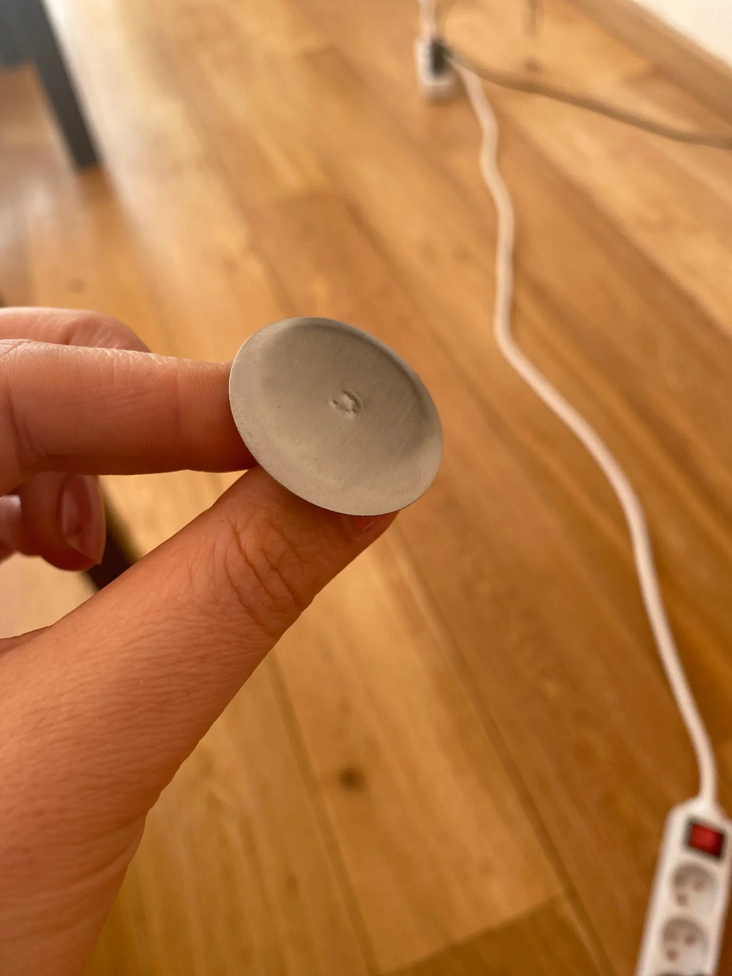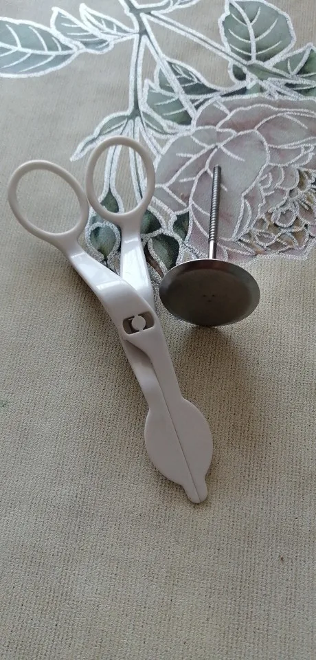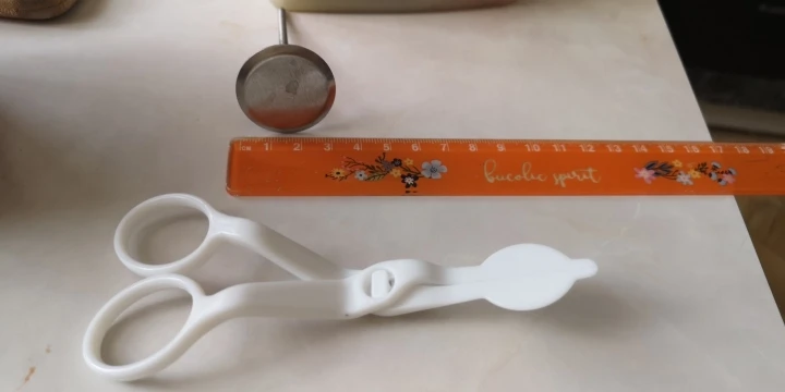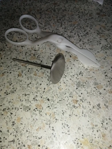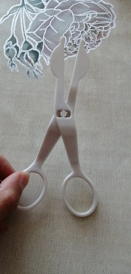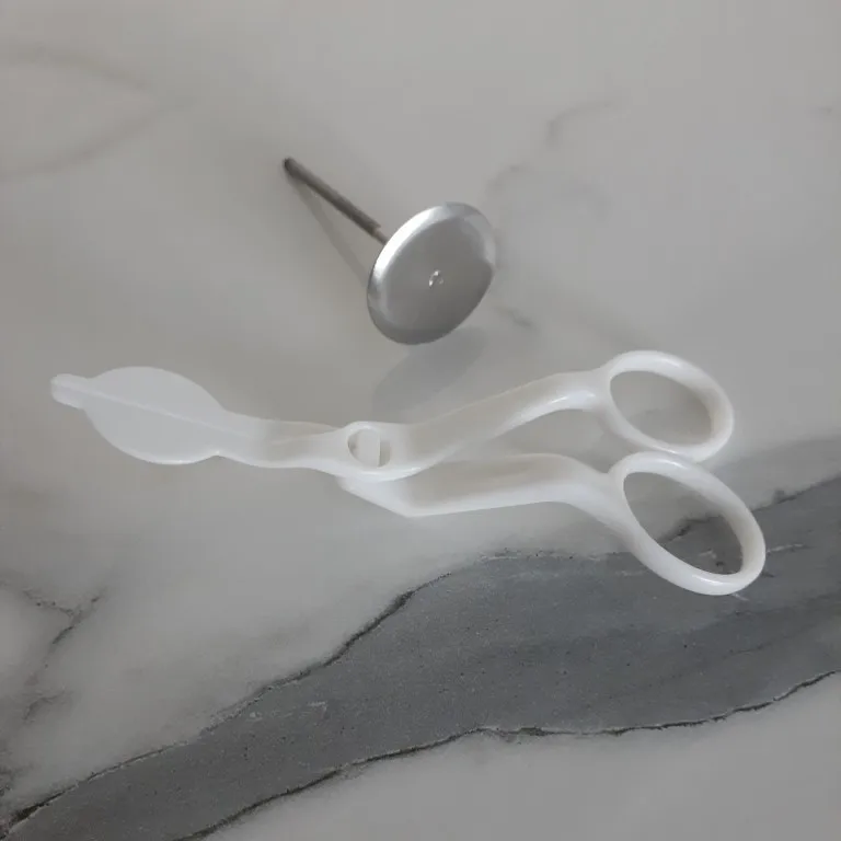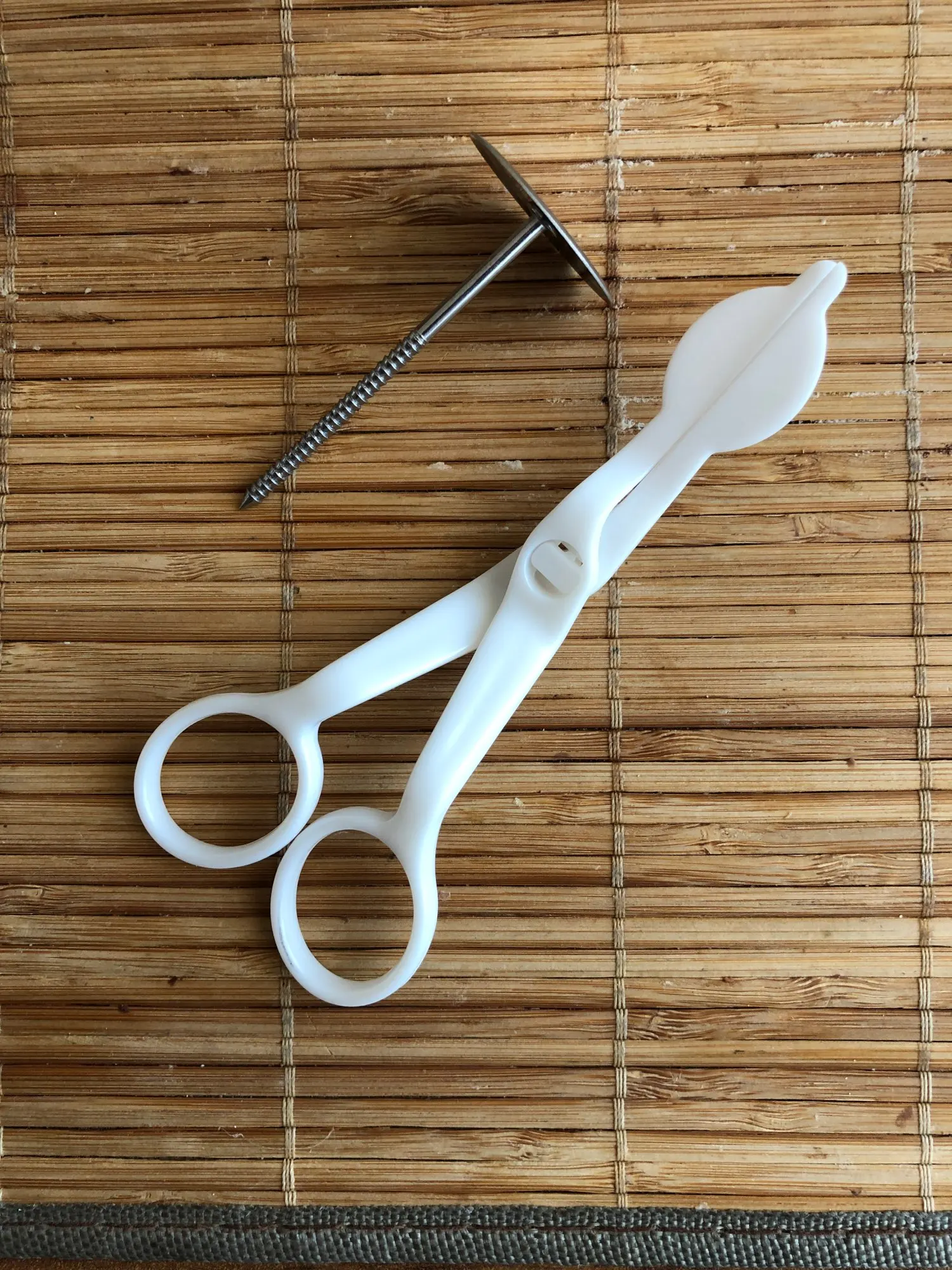 Ножницы пластмассовые пришли целые, гвоздик из толстенького металла похож на нержавейку, шляпка изогнута в трубочку, руками разогнуть не могу.