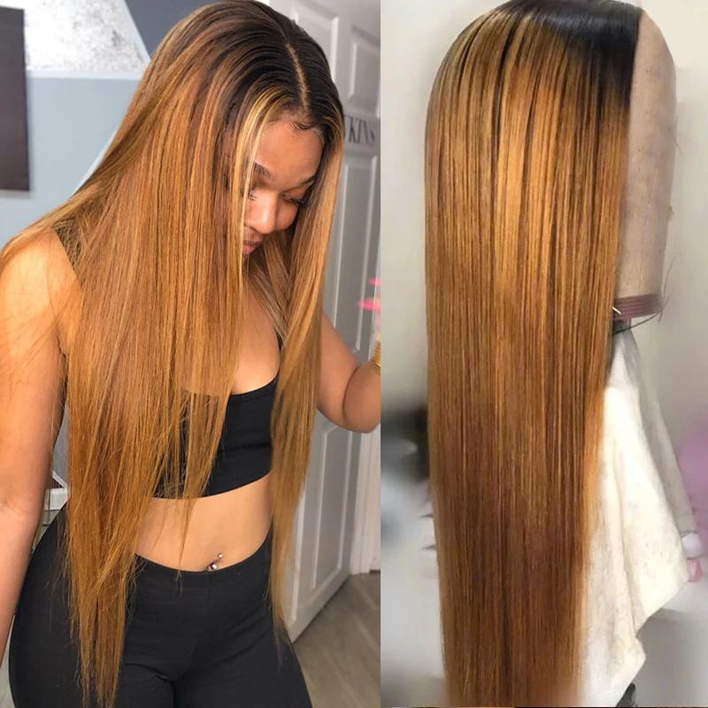 Парики из натуральных светлых волос на шнурке с эффектом деграде, Т-образный парик на шнурке, предварительно выщипанные прямые, 1B27, парики из натуральных волос, бразильский парик с закрытием Реми