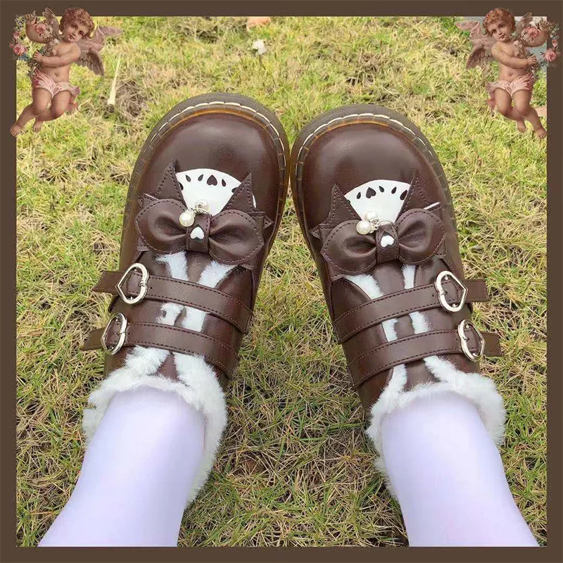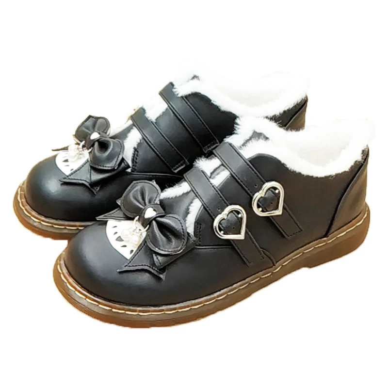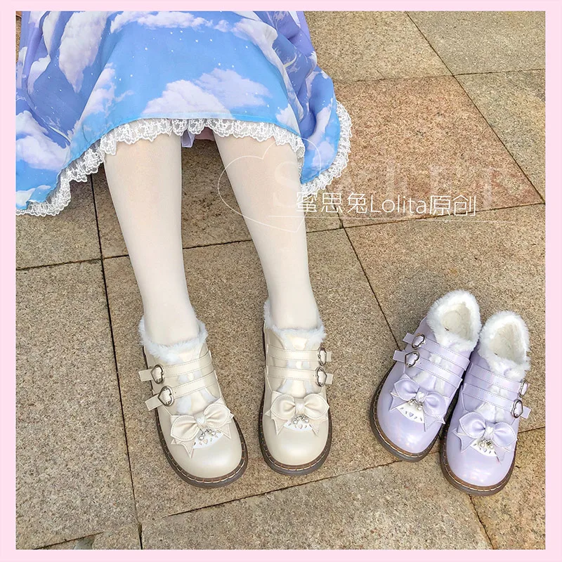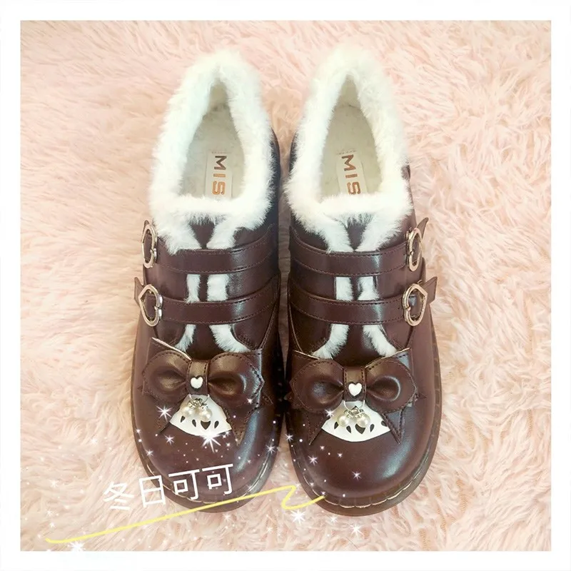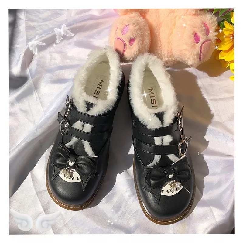 Женские бархатные ботинки Лолита, сапоги из искусственной кожи на низком каблуке, с бантом и двумя пряжками, аниме, для косплея, японская Лолита, большой размер 40, 41, для зимы