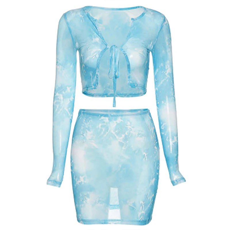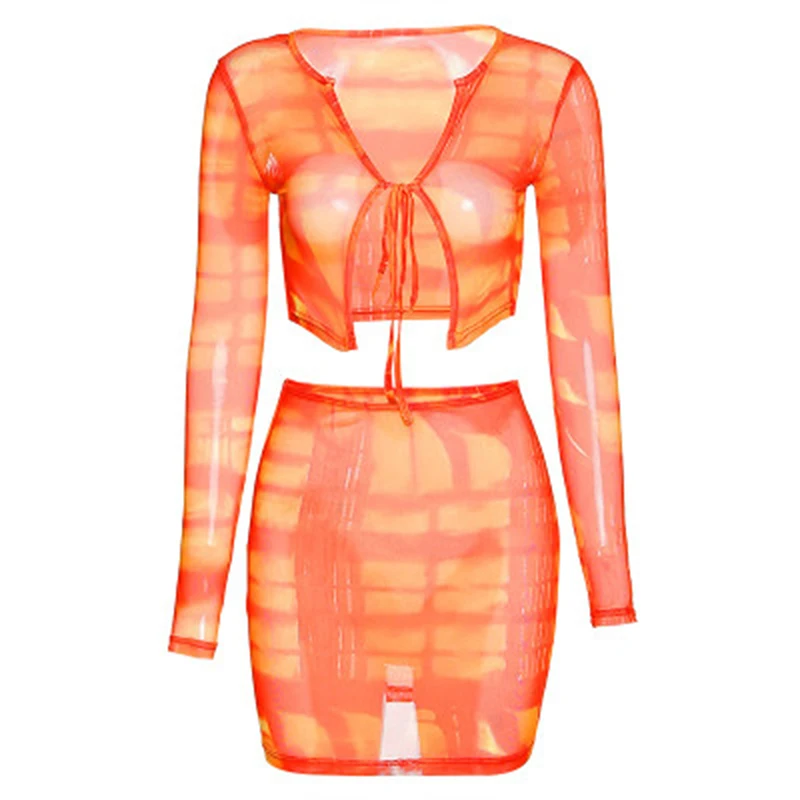 Новинка Осень 2022, Новый Повседневный пикантный темпераментный костюм, Женская Сетчатая футболка с принтом и U-образным вырезом и юбка на бедрах с завышенной талией, женский костюм