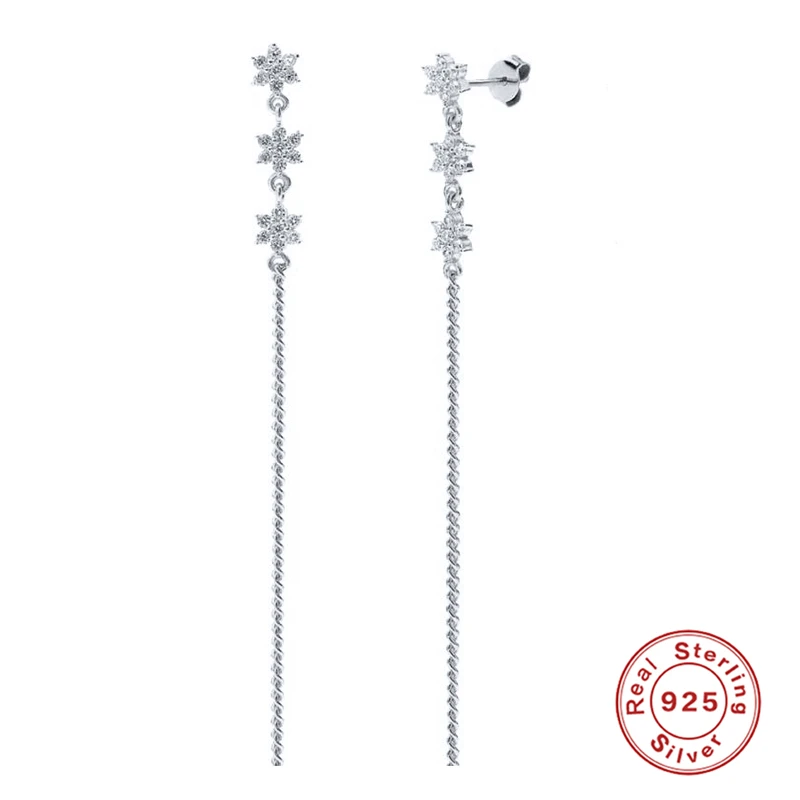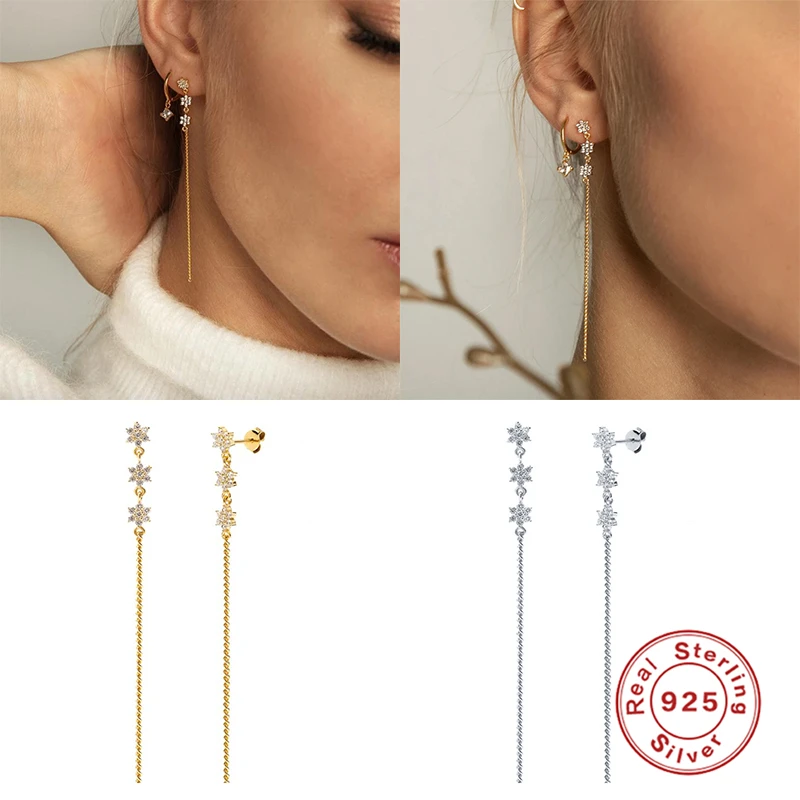 Серьги-гвоздики из стерлингового серебра 925 пробы с цирконием в виде снежинки, цепочка на ухо, модные трендовые женские серебряные украшения для ушей