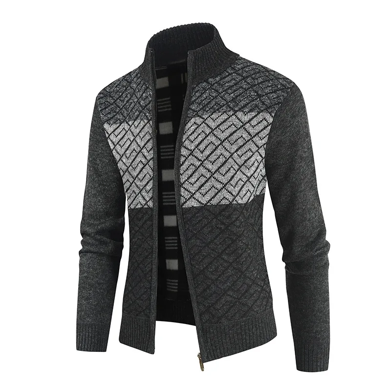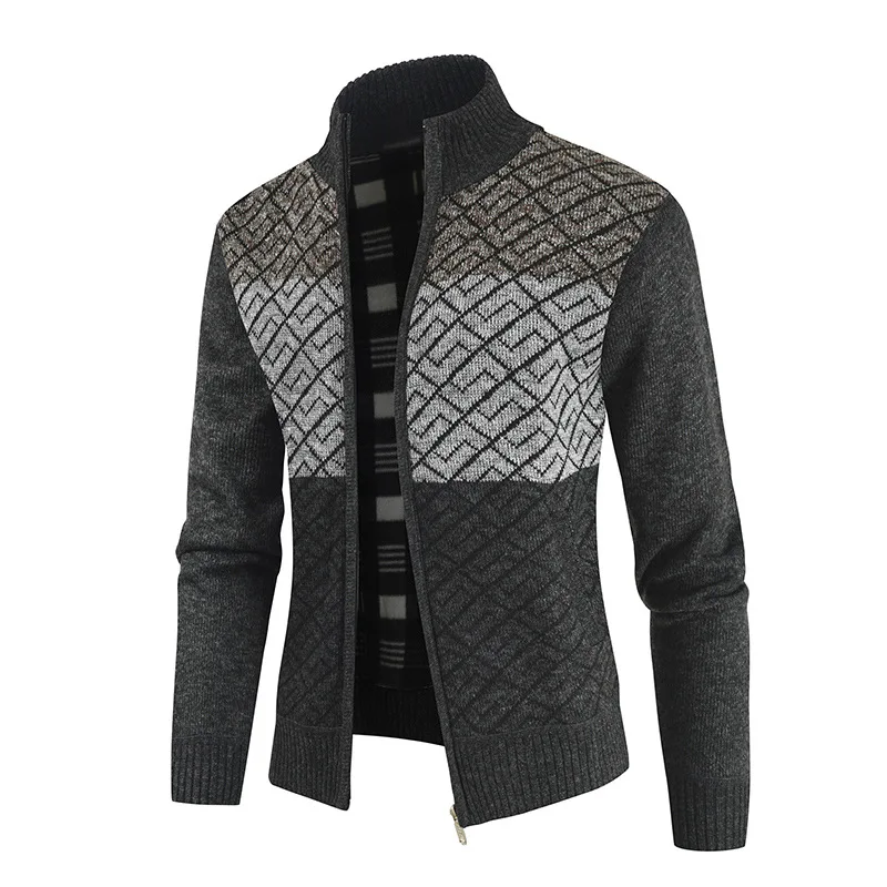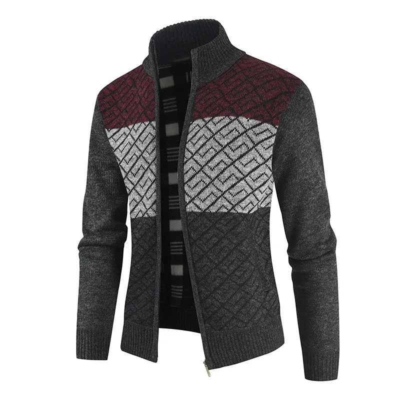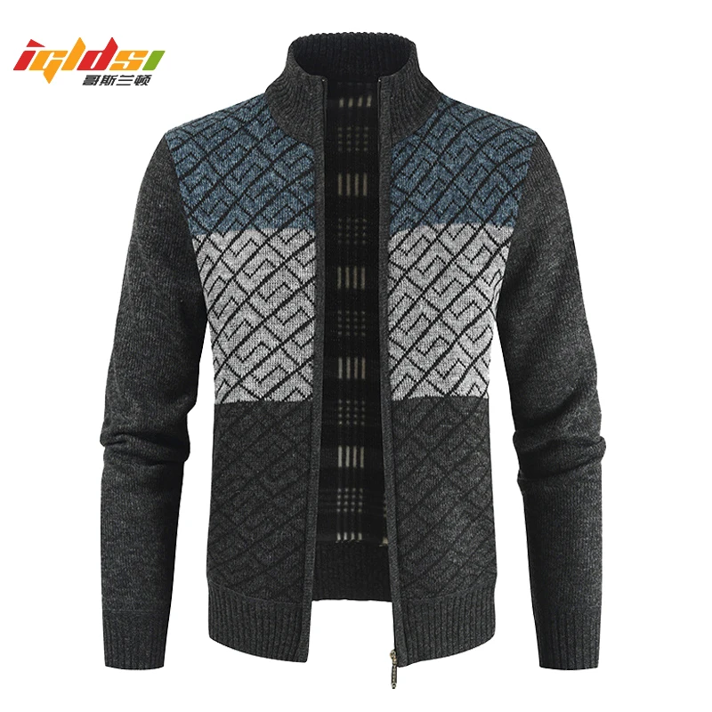 Мужская модная зимняя вязаная куртка в стиле пэчворк, толстый свитер с длинным рукавом, теплый Повседневный Кардиган с воротником-стойкой на осень