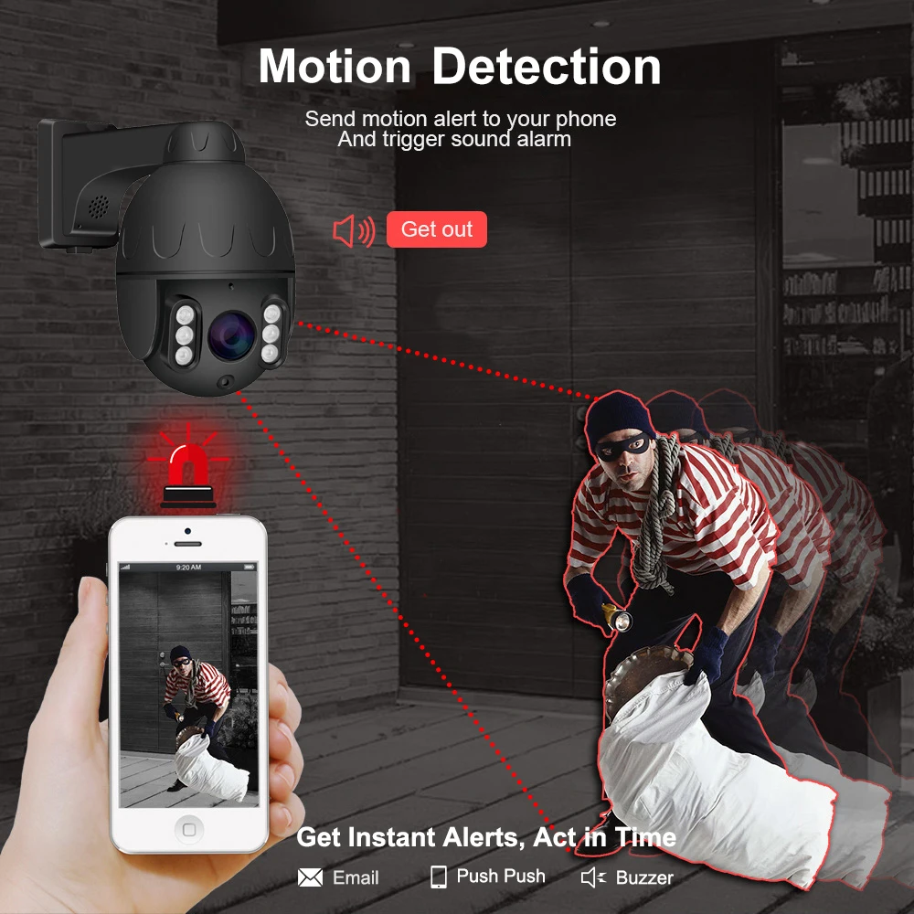 Обнаружение движенияПри обнаружении опасности эта камера наблюдения запускает оповещения, незамедлительно отправляя оповещения по электронной почте и нажимая уведомления на ваше устройство. Вы можете создать определенные зоны для обнаружения движения, чтобы отслеживать определенные области по вашему желанию. Вы можете настроить чувствительность обнаружения движения, чтобы уменьшить Ложные оповещения.