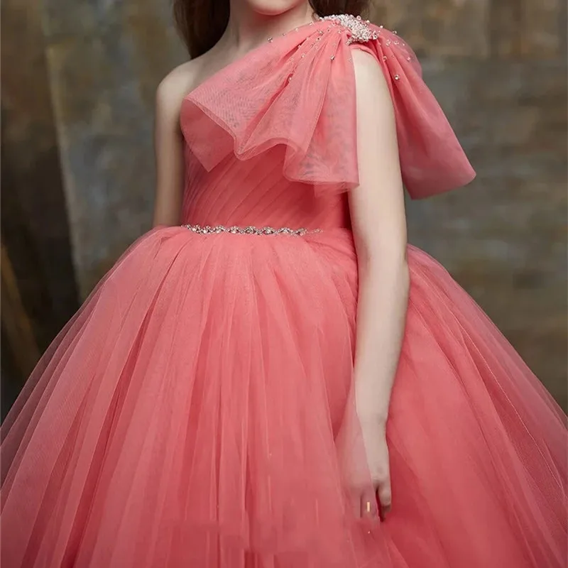 Новые блестящие поясом платье на одно плечо для девочек в цветочек, детские платья, платье принцессы для дня рождения, вечерние платья