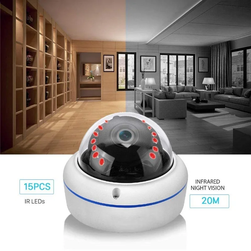 Встроенный ИК-фильтр с 10 шт. ИК-светодиодный массив и 5 шт. Белый светодиодный, 0-20 м ИК-расстояние. По умолчанию используется инфракрасное ночное видение, если вы хотите полноцветное ночное видение, вы можете установить его в приложении.