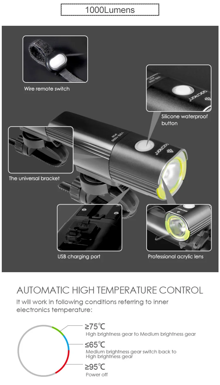 1) корпус из высококачественного аэрокосмического алюминиевого сплава, износостойкий и устойчивый к царапинам, эффективное рассеивание тепла, более длительный срок службы!2) Двойная фара для профессиональной езды.3) Быстрая установка/разборка, защита от кражи, устойчивость защелкивания!4) Он может свободно вращаться на 360 °.5) Зарядка через USB, водонепроницаемость IPX6 (где V9C400-IPX3).6) проводной переключатель/режим замены. Более удобный, быстрый, профессиональный
