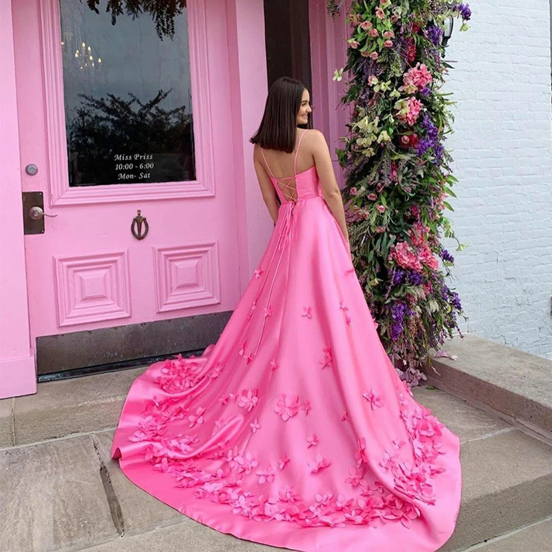 UZN горячая Распродажа на тонких бретелях розовое ТРАПЕЦИЕВИДНОЕ платье для выпускного вечера, сексуальный глубокий v-образный вырез, с цветами и круглым воротом вечернее платье Фея платье для выпускного вечера