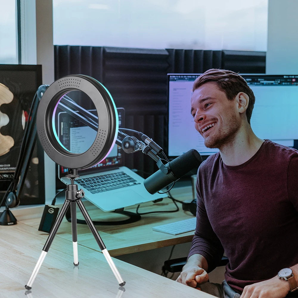15 цветов RGB кольцевой светильник, ваш лучший выбор для фотостудии, макияжа, съемки в реальном времени и подарка.Это идеальный дополнительный продукт для прямой трансляции, записи видео на YouTube.Диммируемая: может регулироваться в 3200K-5600K, подходит для длительной съемки. Плавное затемнение, может регулироваться от 10% до 100%.Подходит для большинства сцен. Например, красный и синий блеск можно использовать для полицейской машины, красочный блеск может использоваться для песни и танцевального зала.USB разъем питания ed: Кольцевой светильник можно подключить к компьютеру, мобильному питанию и т. Д.Высокая Совместимость: интерфейс M1/4 ''резьбовое отверстие, он может использоваться с большинством мини-светильник стенд.
