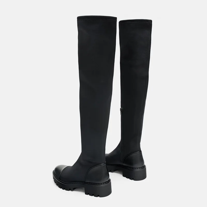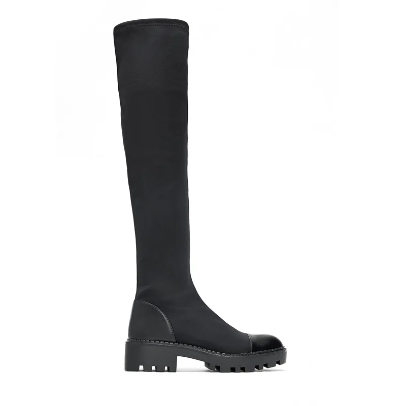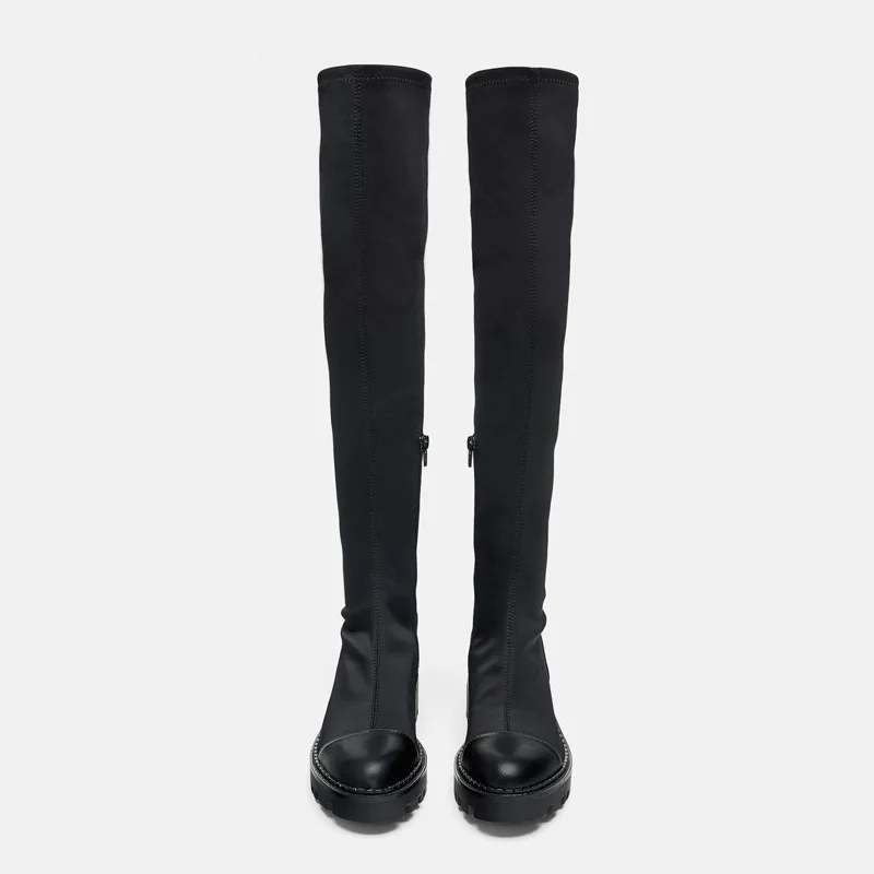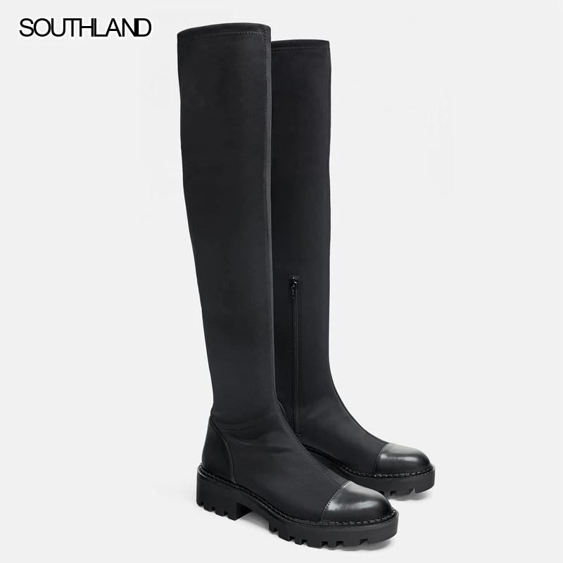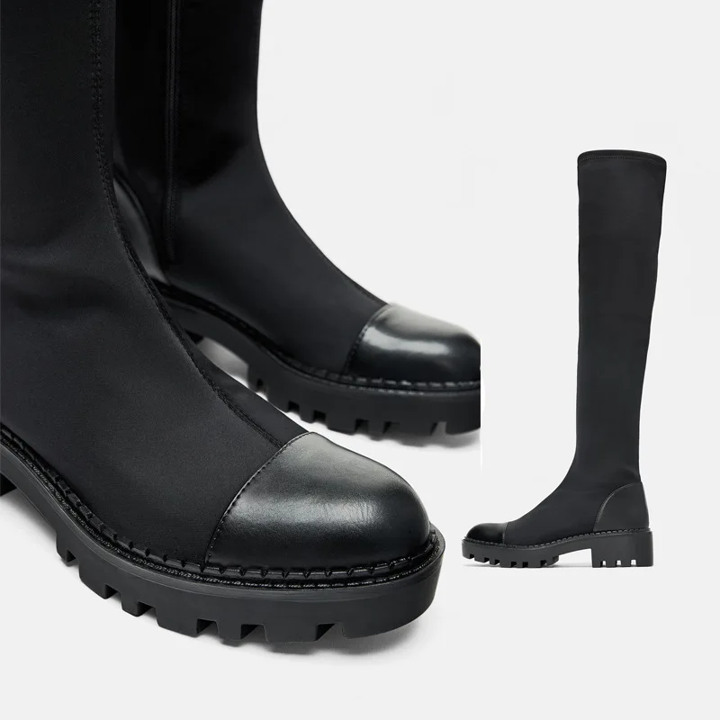 Женские сапоги до колена ZA, черные облегающие ботинки на массивном каблуке, бархатные эластичные сапоги, повседневные замшевые высокие сапоги в стиле пэчворк, зима 2021