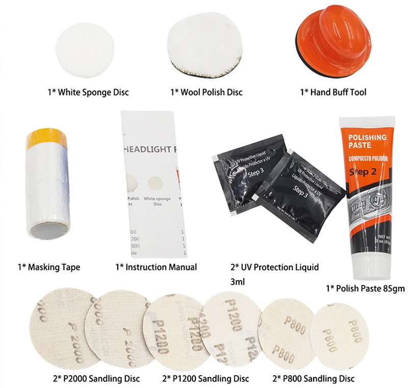 Подготовка: Очистите линзу фары водой. Снимите маску с окружающего периметра линзы, чтобы не царапать краску автомобиля.Step1. ПесокНамочите шлифовальный диск и прикрепите его к задней панели. Песок с тремя различными кругами полностью удаляет тяжелые пожелтения, выцветание и коррозию.Примечание: Используйте шлифовальные диски от грубой до тонкой: P800 --> P1200--P2000. Если этого не сделать, это приведет к сбою восстановленияStep2. ПольскийПрикрепите оранжевый губчатый диск к накладке и нанесите полировочную пасту. Полируйте линзу до тех пор, пока блеск не восстановится в первоначальном состоянии.Примечание: Для достижения наилучших результатов используйте электрический буфер или полировщик. При полировке вручную отполируйте не менее 200 ударов круговыми движениями по часовой стрелке.Step3.ProtectОчистите линзу фары и убедитесь, что линза высохла перед шагом защиты. Используйте белый губчатый диск, предоставленный в комплекте. Равномерно нанесите защитную жидкость на поверхность линзы. После нанесения, оставайтесь на 10-15 минут, чтобы жидкость пролилась равномерно. Затем высушите сразу же на солнце (рекомендуется 1-2 часа). Если нет, пыль и другая грязь будут прилипать для защиты жидкости из-за ее вязкости, которая повлияет на яркость фары.Примечание: Пожалуйста, не допускайте попадания солнечных лучей при нанесении защитной жидкости на фару (очень важно). После шага 3 Держите линзу сухой. Не мойте автомобиль в течение 24 часов