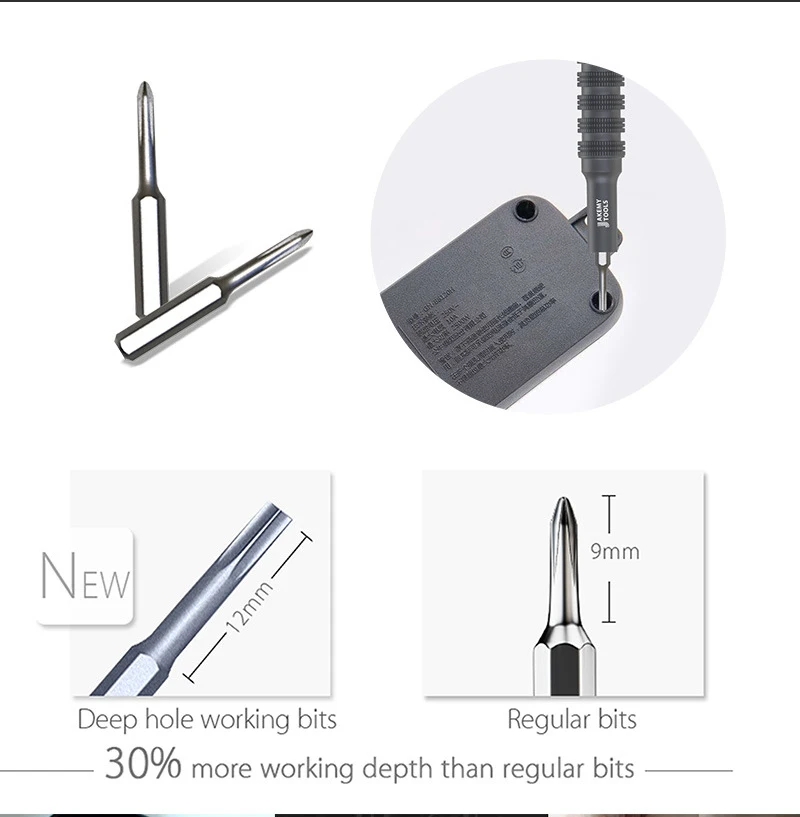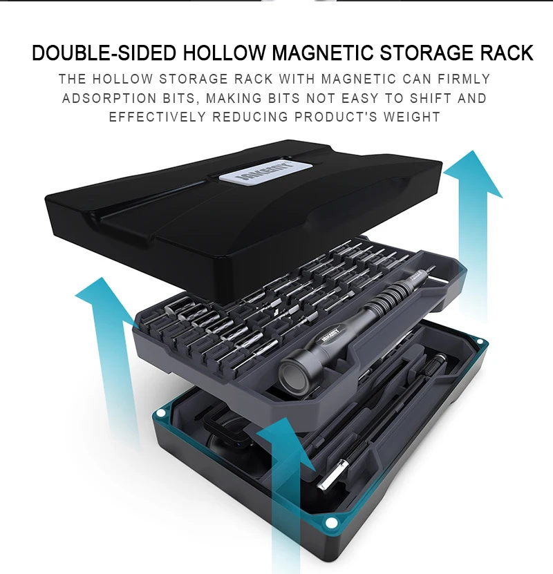 Магнитное устройство со стразами внутри может надежно закрепить Биты Внутренняя магнитная передача на головку битов может облегчить всасывание серёжек Бесшумный подшипник По сравнению с традиционной отверткой, он более плавный и гладкий при использовании ручки с бесшумным подшипником