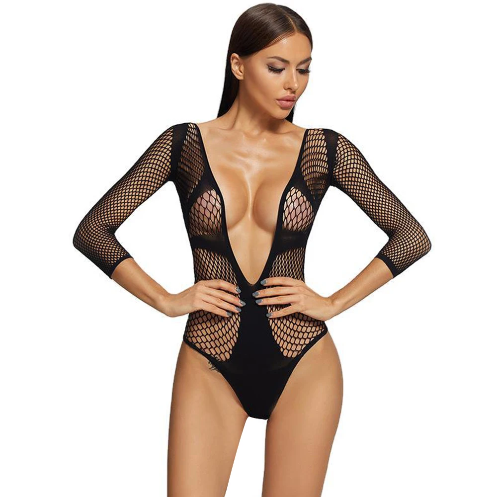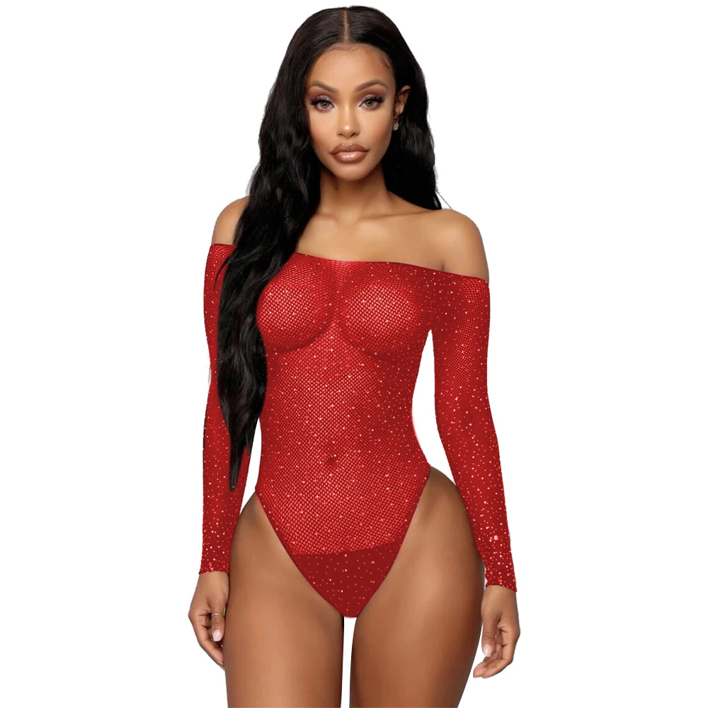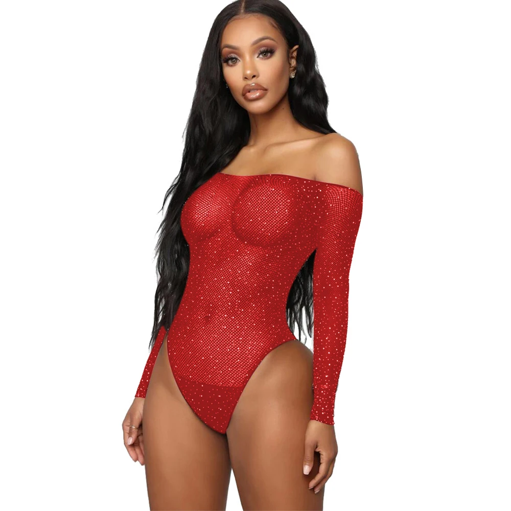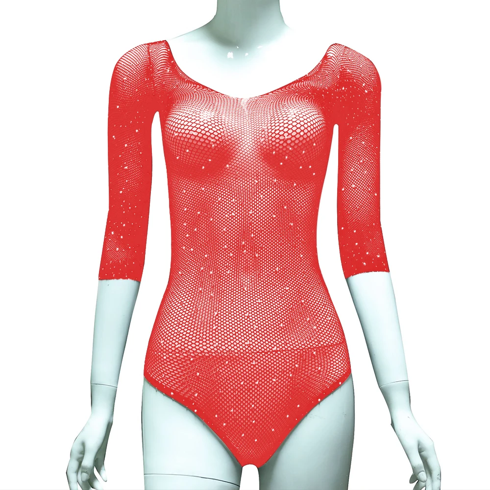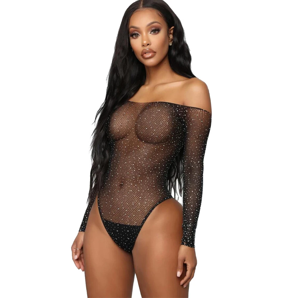 Женское сексуальное боди Стразы, блестящее Сетчатое боди с глубоким V-образным вырезом и длинным рукавом, прозрачное сплошное боди для вечерние