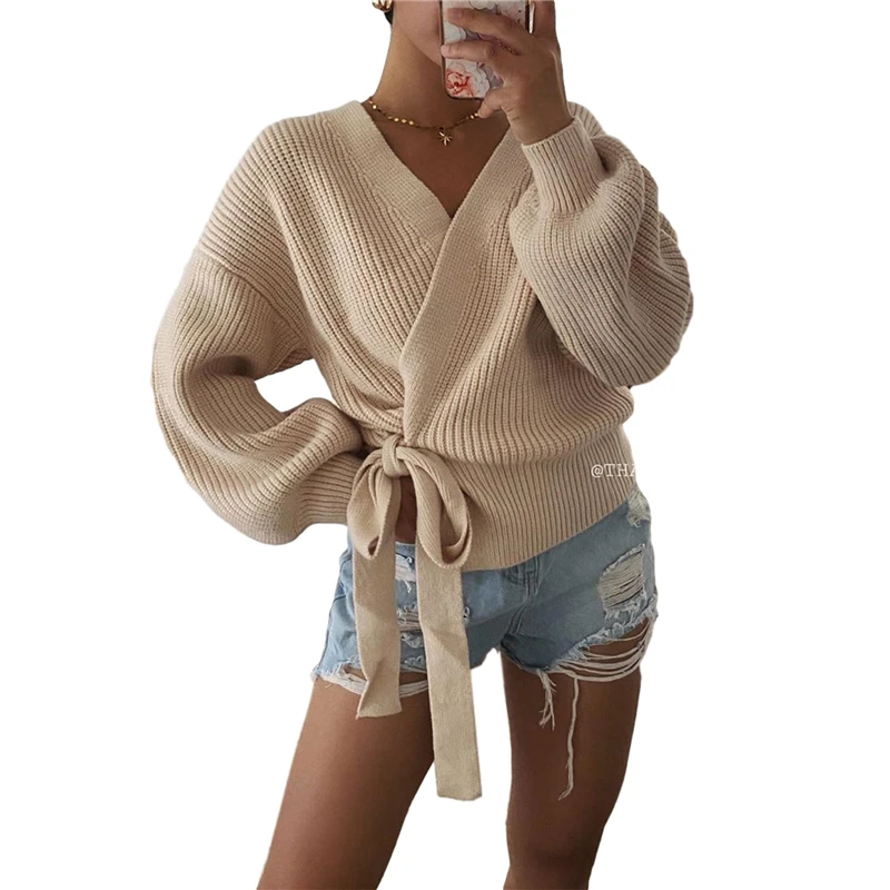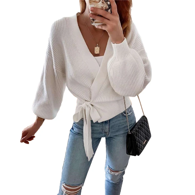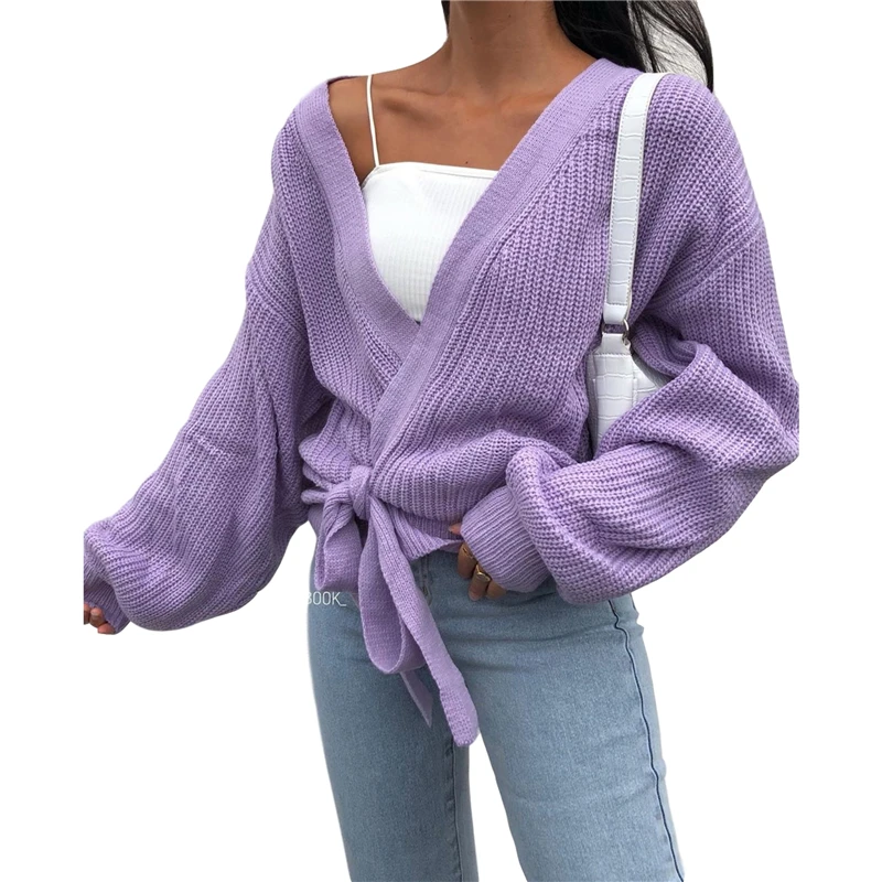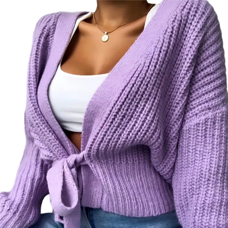 Женский кардиган с V-образным вырезом, однотонный, на шнуровке