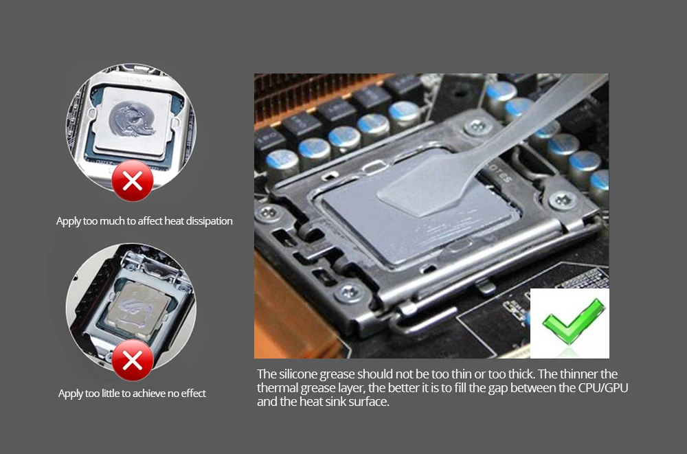 1. Протрите поверхность для очистки, чтобы удалить ржавчину Пыль и масло 2. Сожмите центр поверхности процессора/GPU С маленькой силиконовой смазкой 3. Нанесите изделие шпателем, кистью, Стеклянный стержень и т. Д., и тепловая смазка равномерно Наносится на поверхность 4. После покрытия изделия толщина Предпочтительно толщина бумаги А4