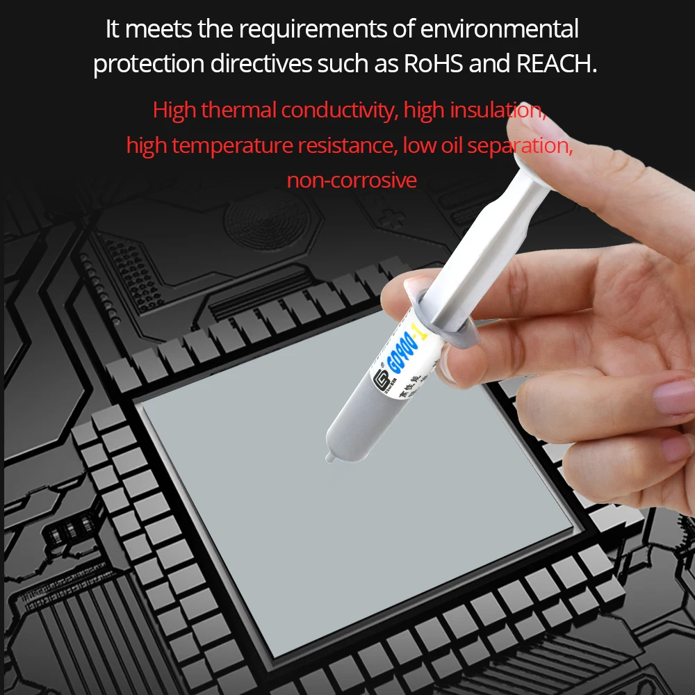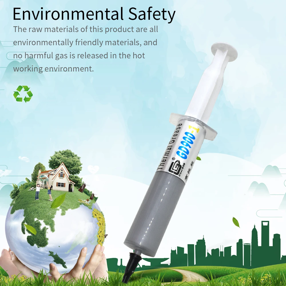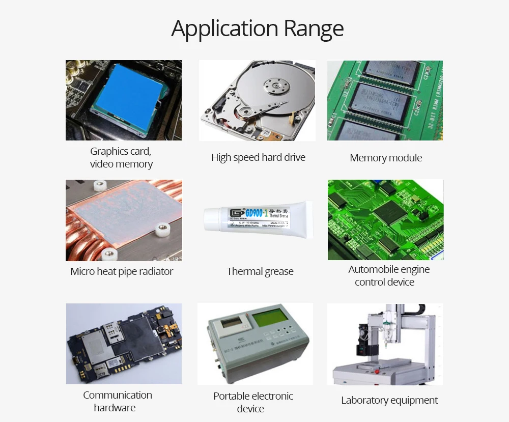 1.GD900-1 Тепловая смазка изготовлена из более тонкого окисленного металла в качестве основного сырья. Используется для заполнения зазора между нагревательным элементом и теплоотводом. Он имеет сильную теплопроводность на CPU / GPU/светодиодный, чтобы удовлетворить вашу систему охлаждения. Высокие стандартные требования 2. Он отвечает требованиям директив по охране окружающей среды, таких как ROHS и REACH Высокая теплопроводность, высокая изоляция, высокая термостойкость, низкое Разделение масла, некоррозионный 3. Заполнение зазора между теплом и теплоотводом для увеличения площади контакта для лучшей теплопроводности 4. Безопасность окружающей среды: Сырье этого продукта-это экологически чистые материалы, и никакого вредного газа не выделяется в горячей рабочей среде
