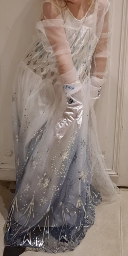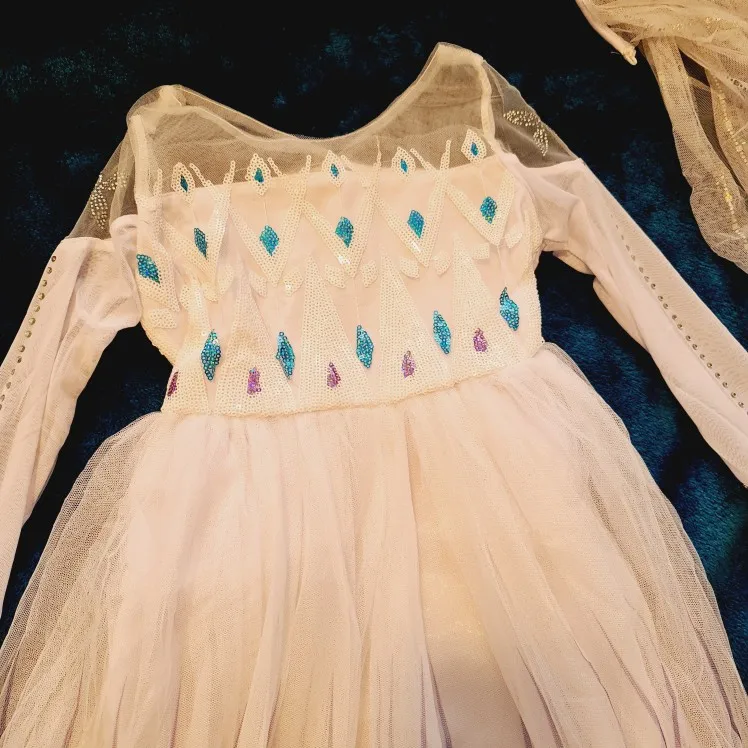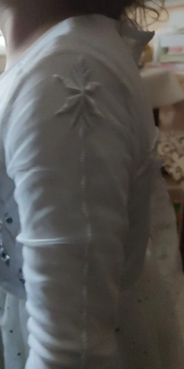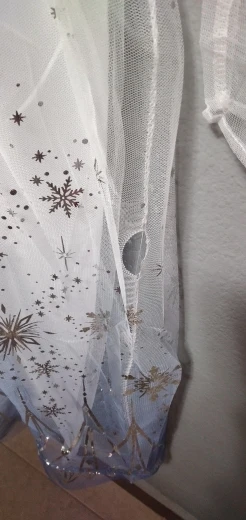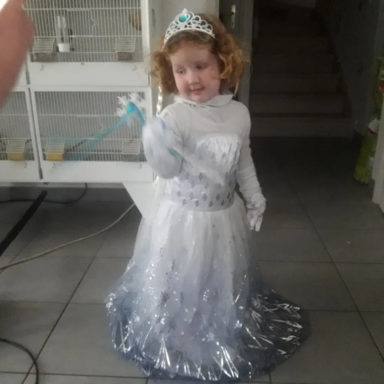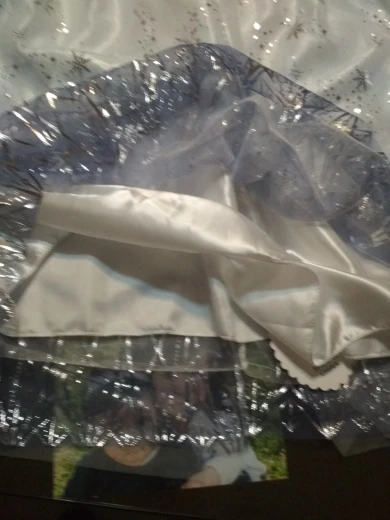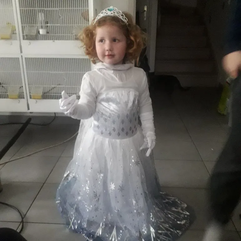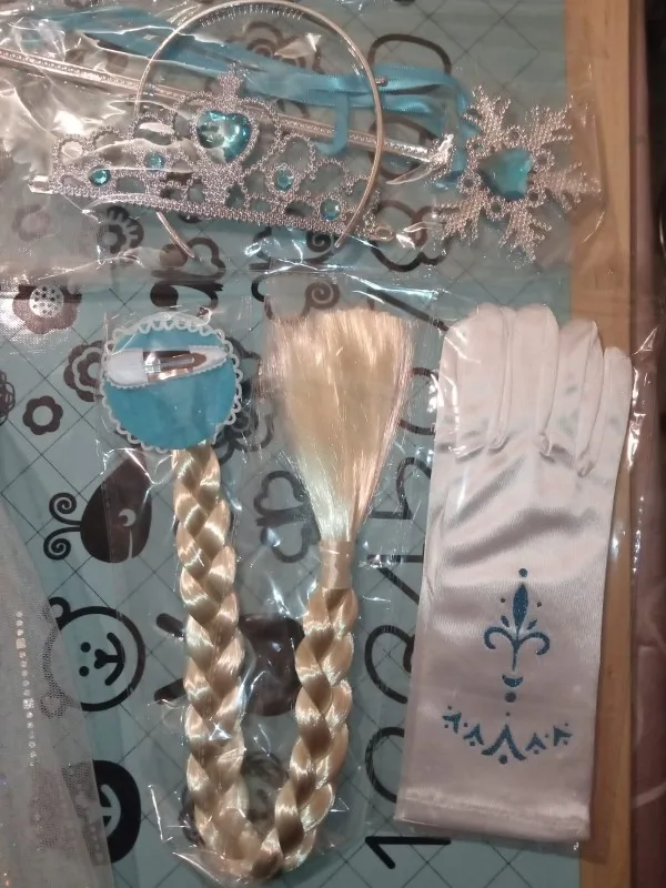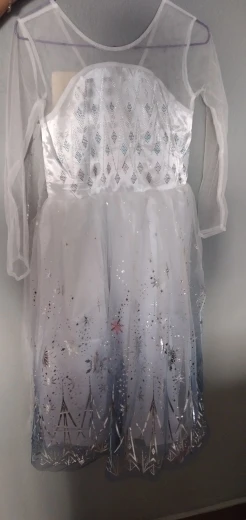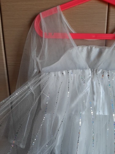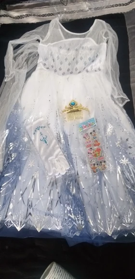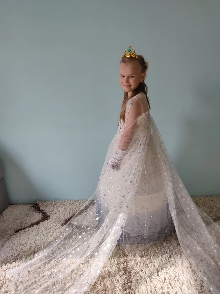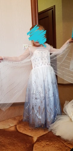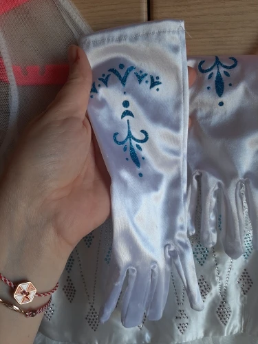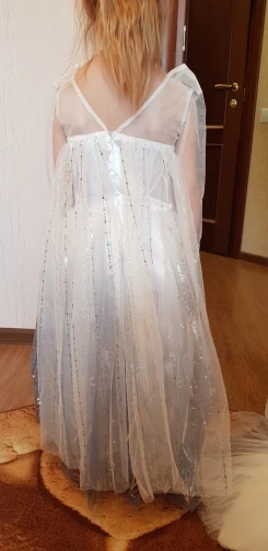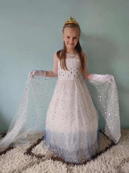 Платье своих денег стоит. Выглядит нарядно, красиво блестит. Очень длинное-по пятки. Верх (там где стразы ромбиком наклеены ) из ткани типо шелк-не тянется! Низ т.е. юбка из трех слоёв(шёлк , белая сетка и сетка с рисунком снежинок). Сзади замок. По поводу размера: на платье и упаковке написано 110(3Т) . На девочку ростом 108см(ровно 4 года) большеват верх. Чтоб одеть на праздник придётся в плечах ушить как-то, иначе талия не наместе. Перчатки из ткани которая тянется. Мягкие. Подойдут только на детскую ручку. Корона жёлтая выполнена типо гребешок((( Впринципе всем доволна. Рекомендую к покупке. идеально думаю на 4.5 года. в подарок положили наклейки мики маус.