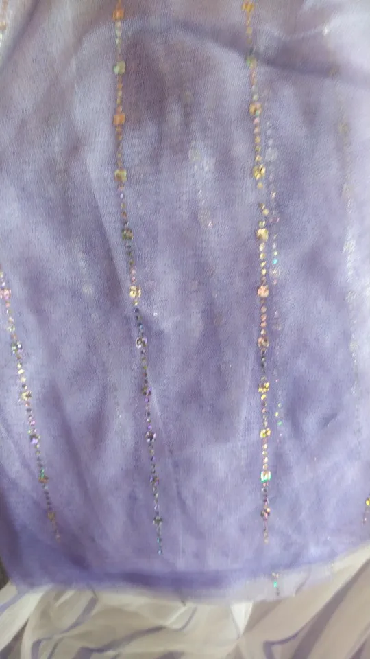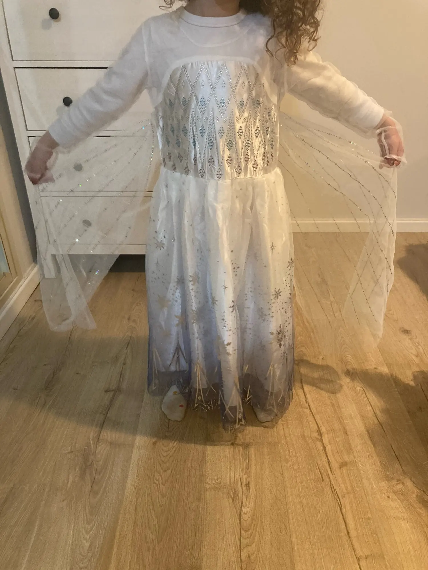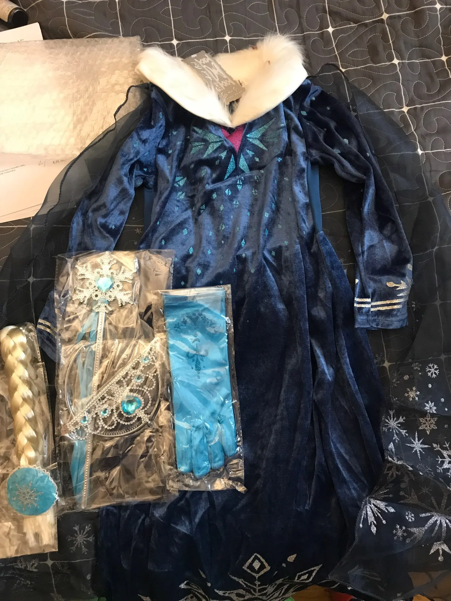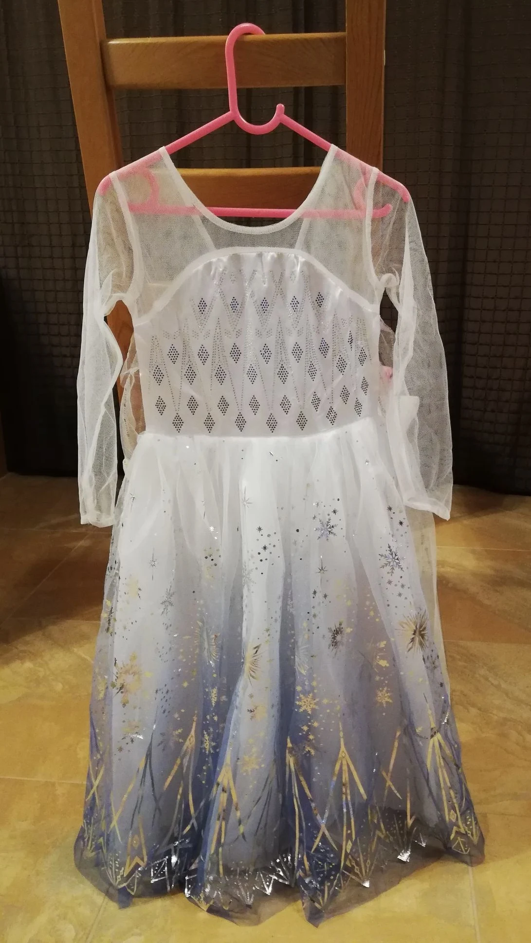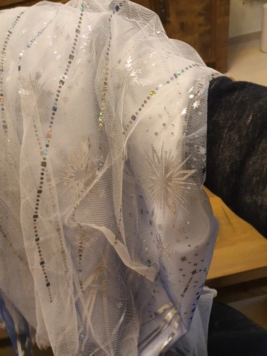 Платье своих денег стоит. Выглядит нарядно, красиво блестит. Очень длинное-по пятки. Верх (там где стразы ромбиком наклеены ) из ткани типо шелк-не тянется! Низ т.е. юбка из трех слоёв(шёлк , белая сетка и сетка с рисунком снежинок). Сзади замок. По поводу размера: на платье и упаковке написано 110(3Т) . На девочку ростом 108см(ровно 4 года) большеват верх. Чтоб одеть на праздник придётся в плечах ушить как-то, иначе талия не наместе. Перчатки из ткани которая тянется. Мягкие. Подойдут только на детскую ручку. Корона жёлтая выполнена типо гребешок((( Впринципе всем доволна. Рекомендую к покупке. идеально думаю на 4.5 года. в подарок положили наклейки мики маус.