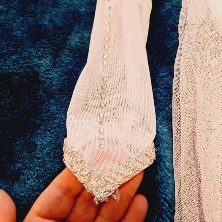 Красивое платье, сшито аккуратно, кристаллы приклеены ровно, выглядит отлично, упаковано в отдельный пакет на зип-локте, в котором и потом можно хранить. Все аксессуары хорошо выглядят, без потертостей, неровных краёв и прочих подобных косяков, доехали целыми.