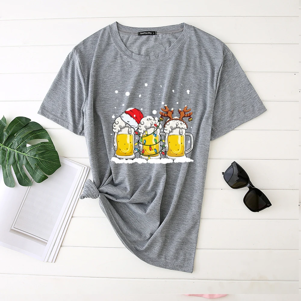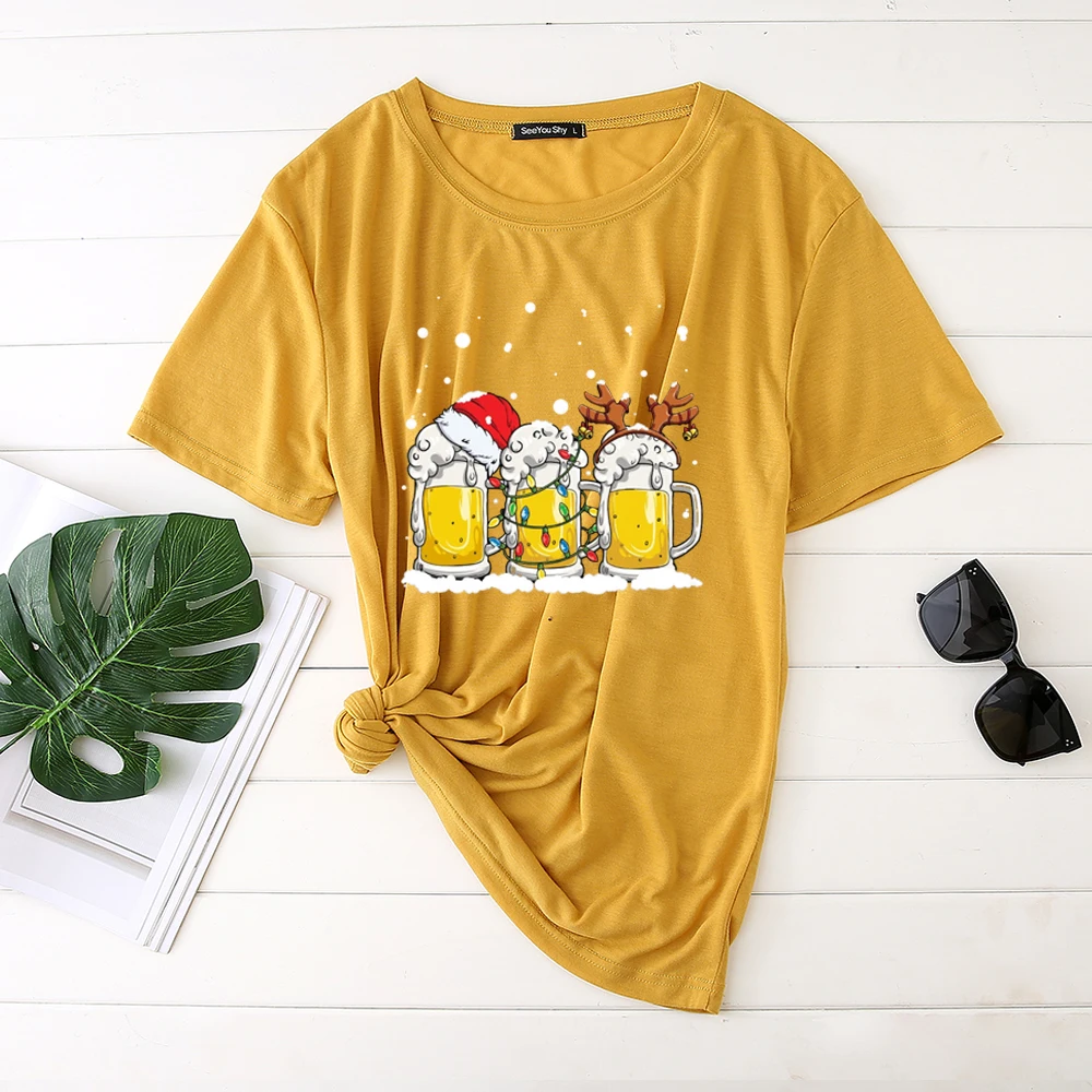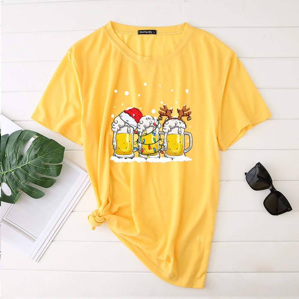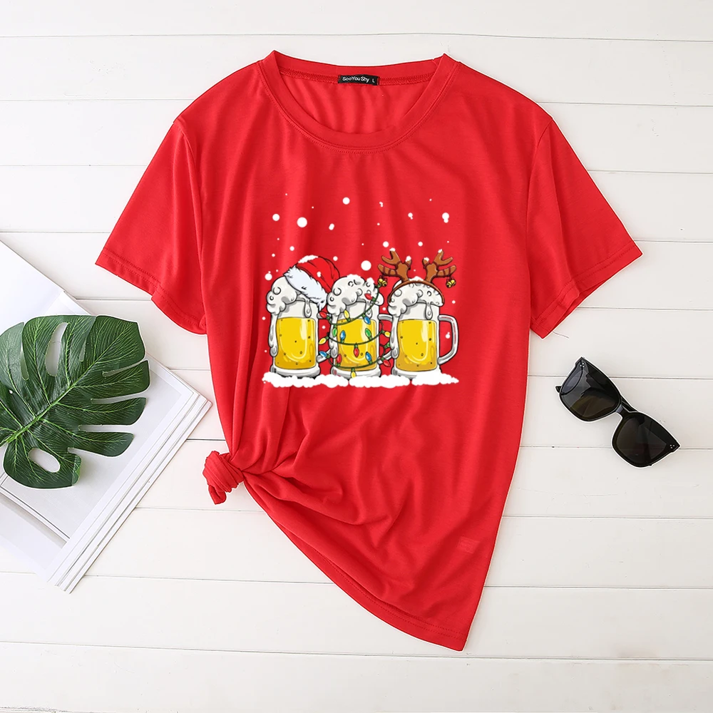 Seeyoushy женские майки три стакана с принтом "пиво" Рождество принтовые тройники Модные женские ботинки черного цвета; Платье с коротким рукавом; Одежда размера плюс