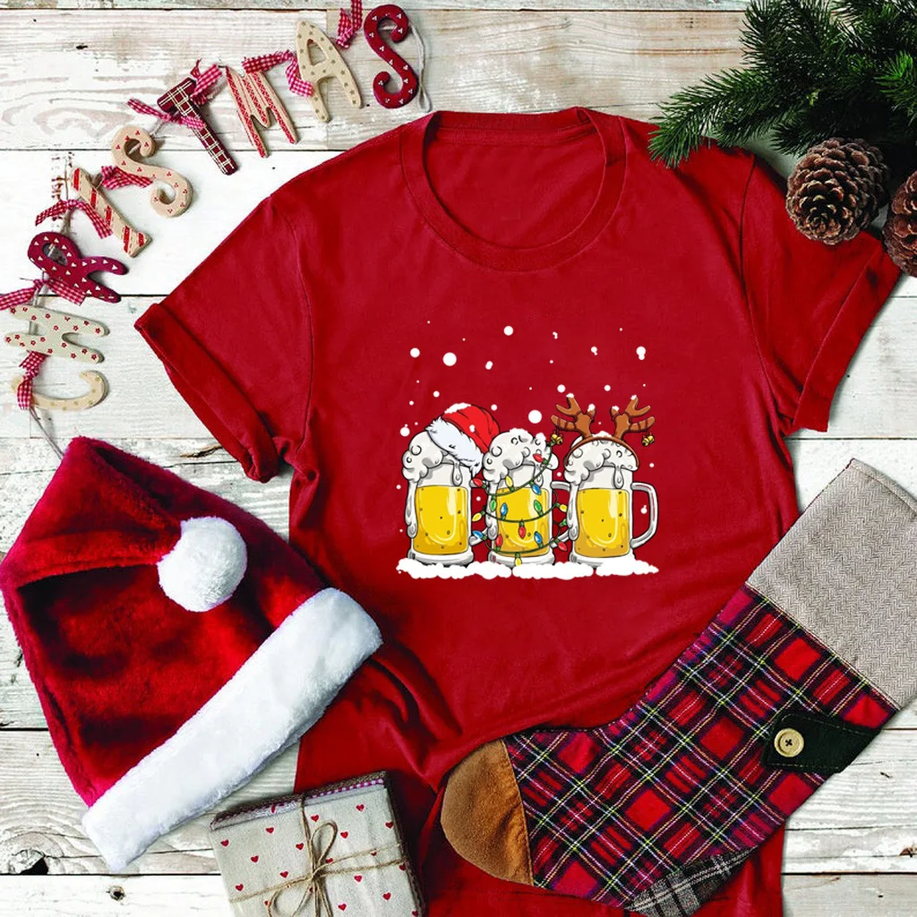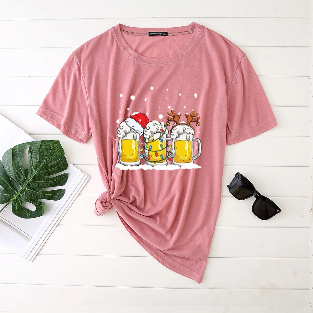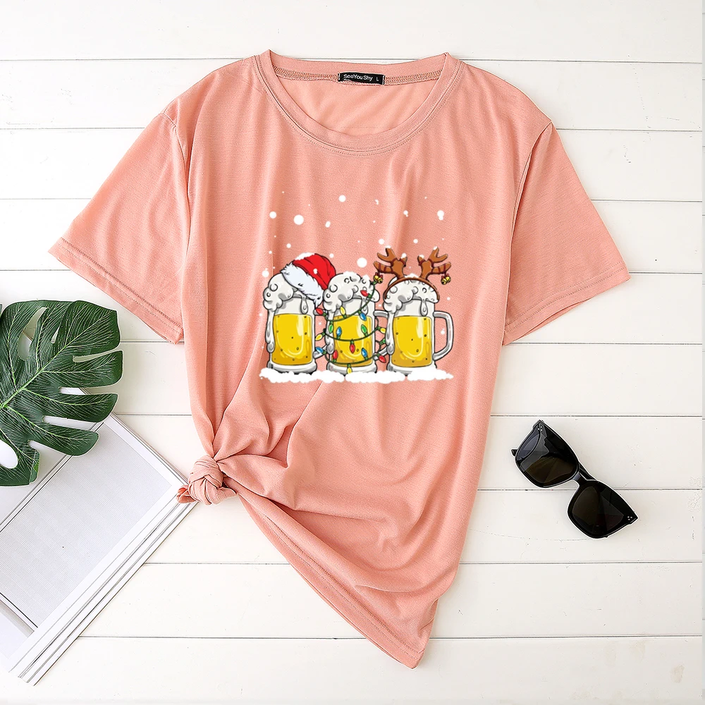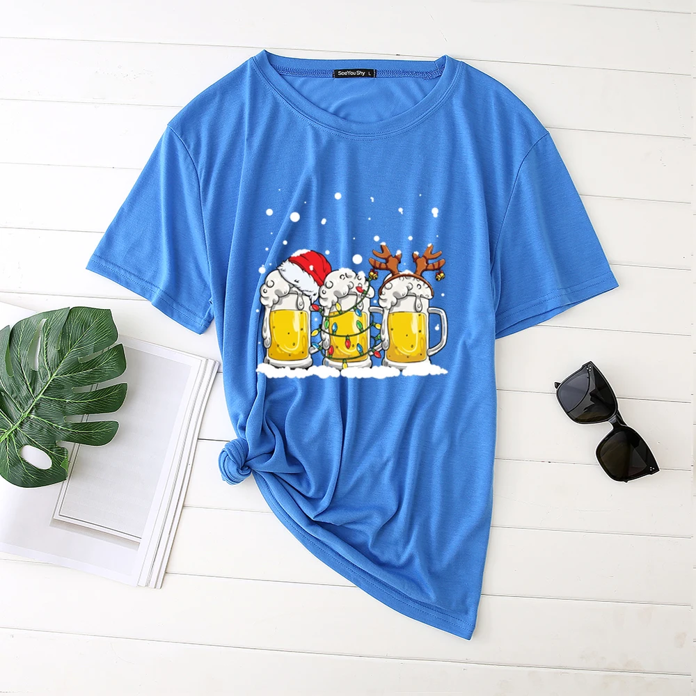 Seeyoushy женские майки три стакана с принтом "пиво" Рождество принтовые тройники Модные женские ботинки черного цвета; Платье с коротким рукавом; Одежда размера плюс