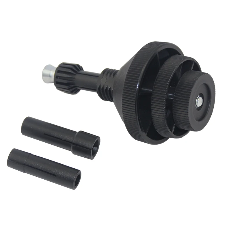 -Проденьте колесо воронки на центр тела, с ребрами, обращенными в том же направлении, что и на неподвижном колесе, что и Гладкая сторона колеса, обращенная вдали от неподвижного колеса. Выберите подходящий набор, в зависимости от размера сцепления, и сползайте на центральный вал. Вставьте центральный вал и соберите через центральный корпус и резьбовое маленькое колесо на конец вала