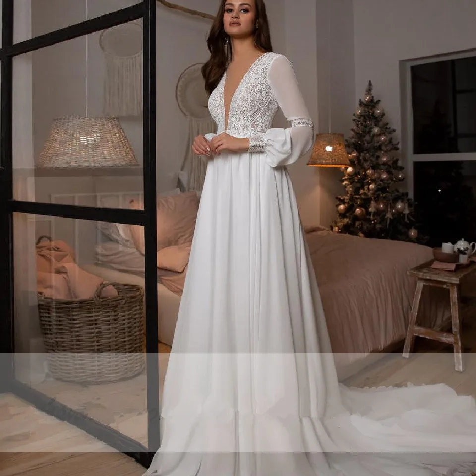 Свадебное платье-трапеция в стиле бохо, с длинными рукавами, кружевное шифоновое длинное платье невесты, с глубоким V-образным вырезом и открытой спиной, 2020