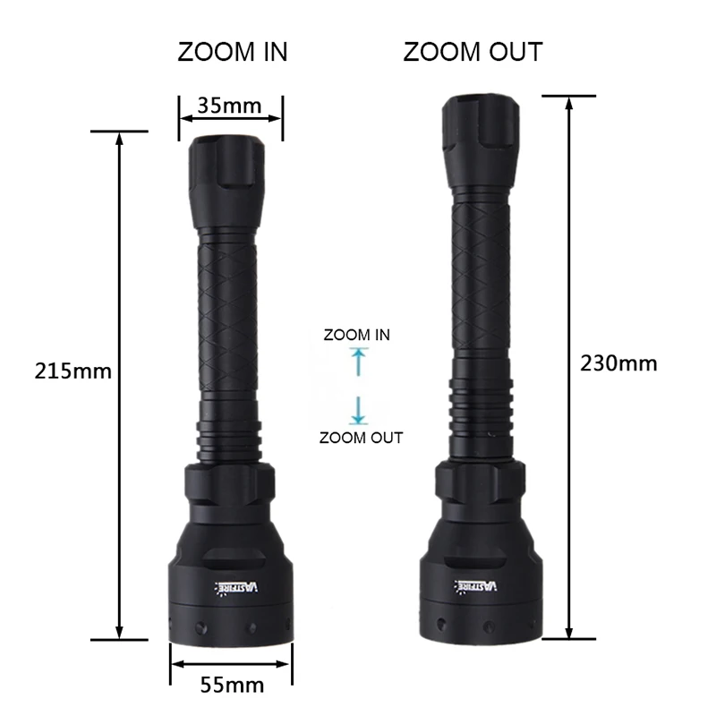 50 мм Функция Поворотная фокусировка объектива позволяет фокусироваться на узком прожекторе или на обратной стороне для эффекта потока, специально разработанная для дальней подсветки. T50 может освещать гораздо дальше сфокусированным лучом, по сравнению с освещением без фокусирующих функций.