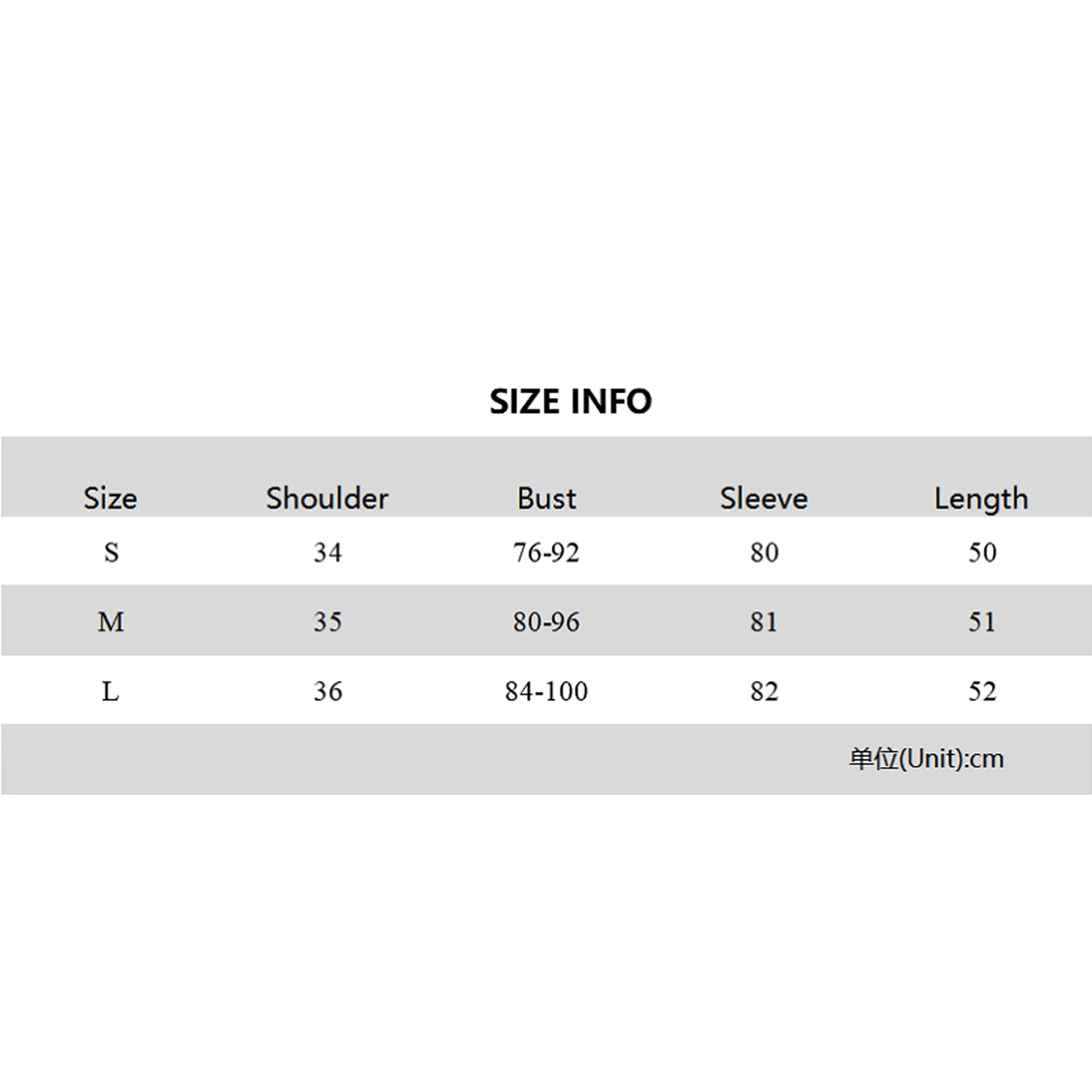 SДлина:19,69Бюст:29,92-36,22Рукав:31,50Плечо:13,39