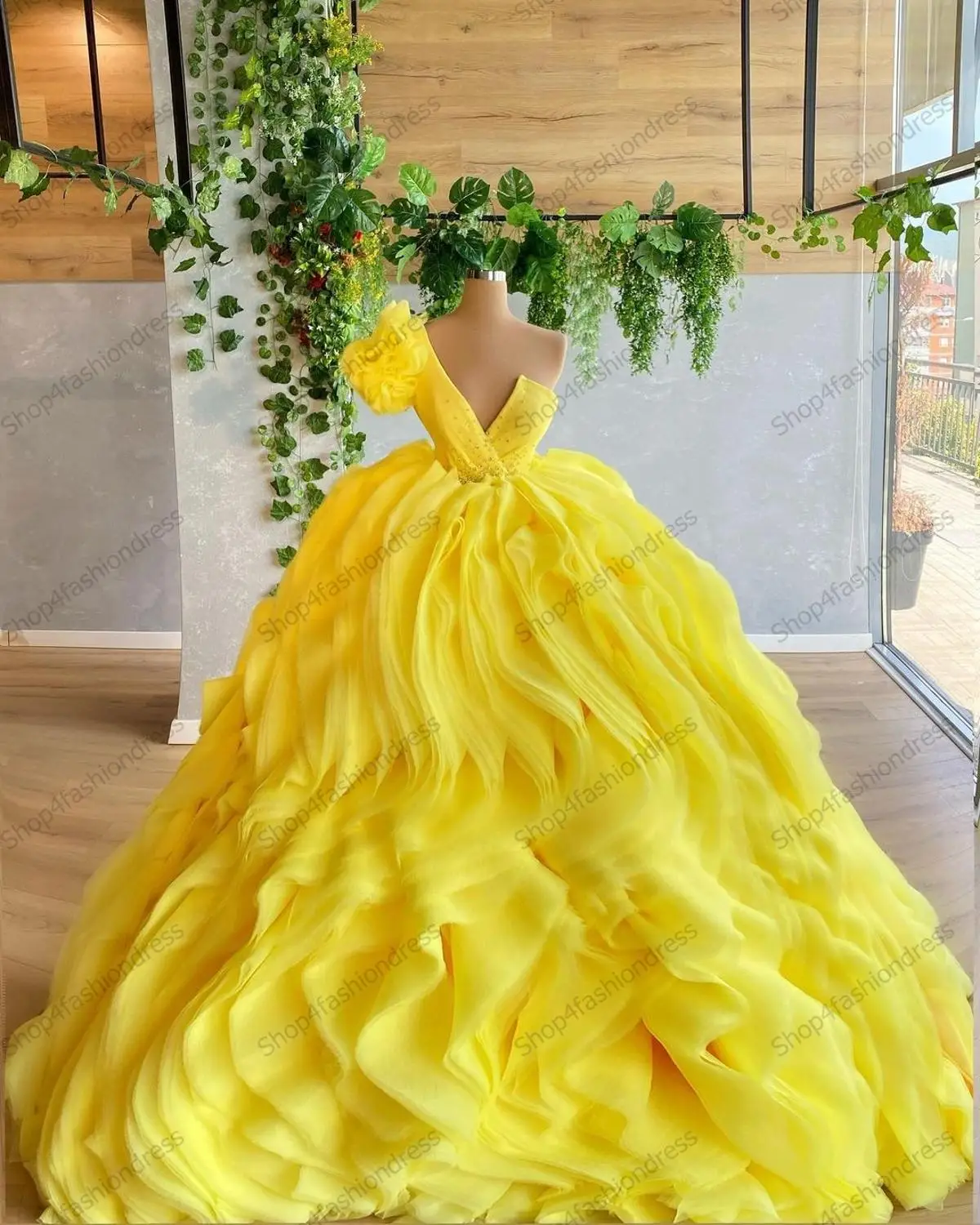 Пышное желтое фатиновые платья для выпускного вечера принцессы с от...