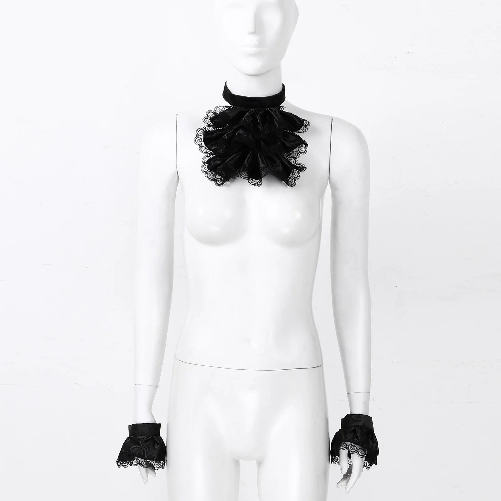 Многослойный атласный жабо украшен кружевной отделкой края. В комплекте идет пара манжет.