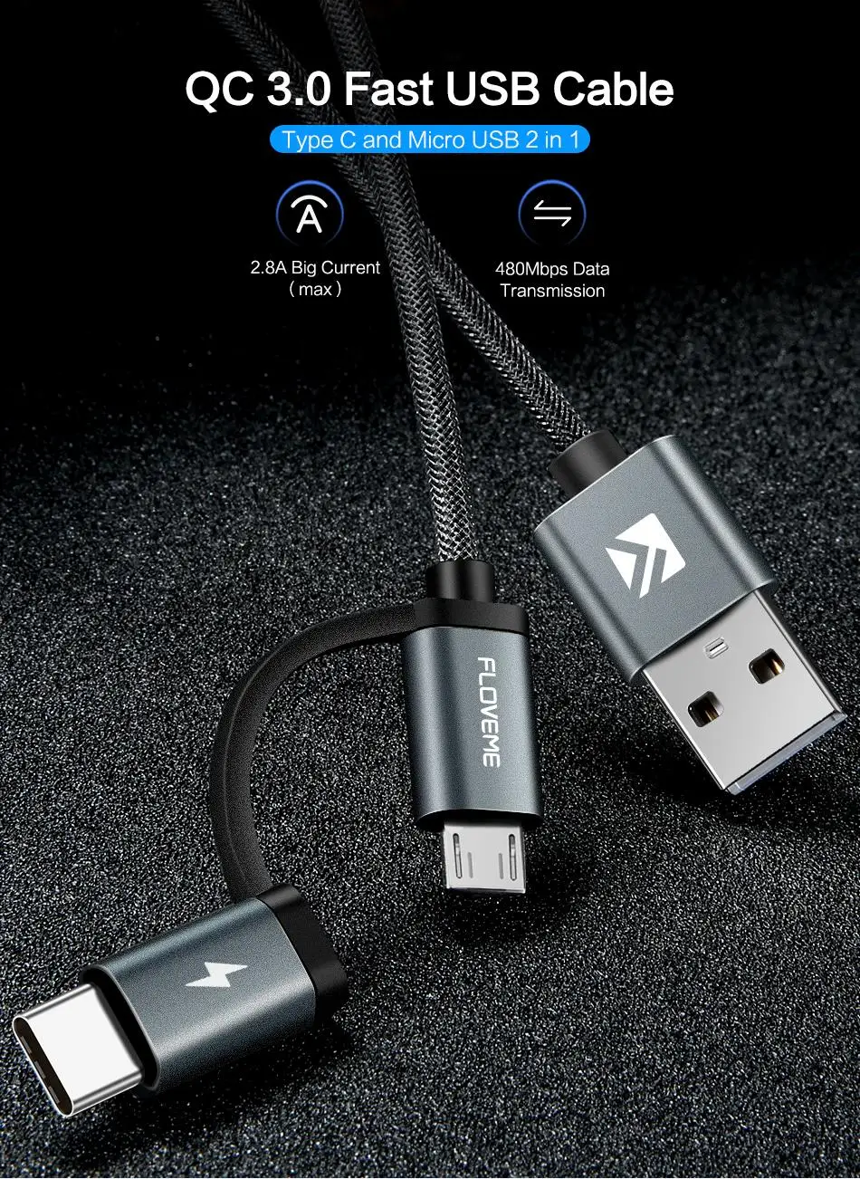 FLOVEME-2 в 1 микро USB кабель для быстрой зарядки USB Type-C для быстрой зарядки QC 3,0 Для Xiaomi samsing Huawei и Samsung Тип C мобильный телефон кабель