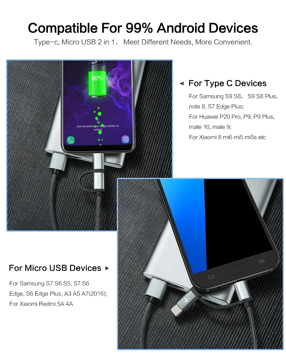 FeatureQC 3.0 Type C & Micro USB 2 in 1 Fast Charger Cable Phone USB Cables