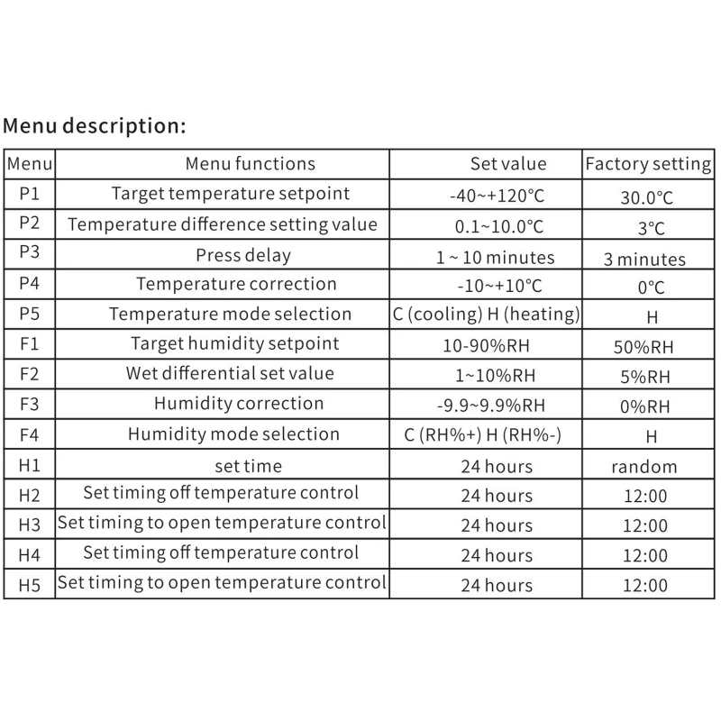 ②Длительное нажатие, чтобы войти в интерфейс настройки, короткое нажатие кнопки настройки в интерфейсе настройки, чтобы выбрать контроль температуры и влажности или режим времени (то есть Переключение режима P и F и H)