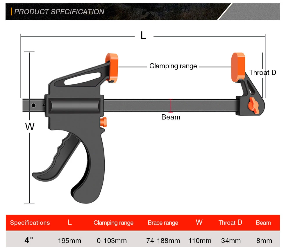 1. Товар: F зажим для обработки дерева2. Материал: пластик3. Цвет: черный и оранжевый