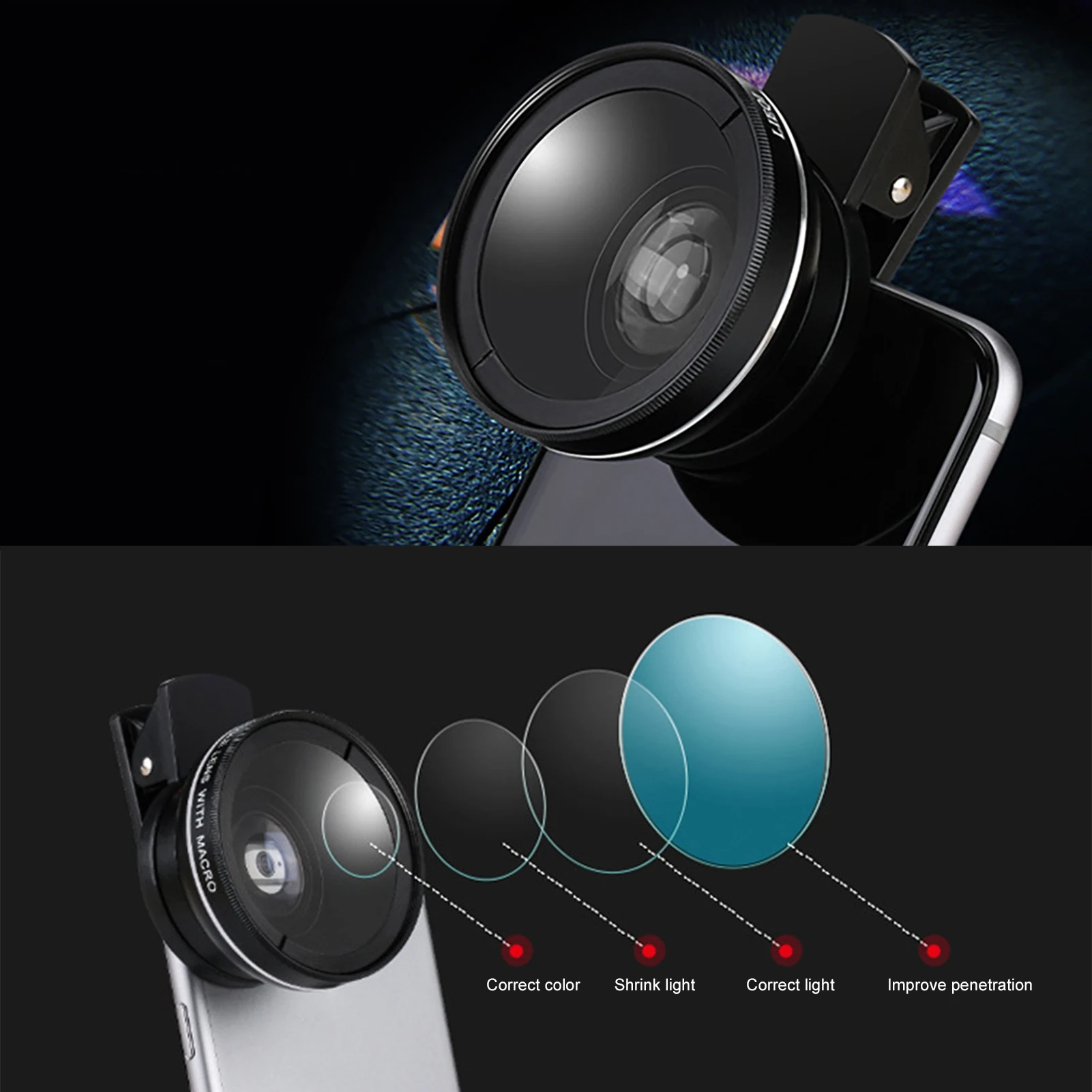 Универсальный объектив эффективно решает проблему темного угла широкоугольного объектива на некоторых мобильных телефонах.