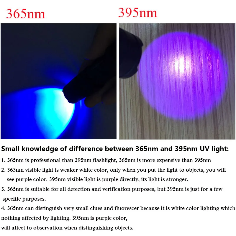 1. Профессиональный фонарик нм, 365 нм дороже 395 нм2. Видимый светильник 365 нм-слабее белый цвет, вы увидите фиолетовый цвет, только когда вы кладете светильник на объекты. 395 нм видимый светильник фиолетовый, его светильник сильнее.3. 365 нм подходит для всех целей обнаружения и проверки, но 395 нм только для нескольких конкретных целей.4. 365 нм могут различать очень маленькие подсказки и флуоресцентные лампы, потому что это освещение белого цвета, на которое не влияет освещение. 395нм-фиолетовый цвет, будет влиять на наблюдение при различении объектов.