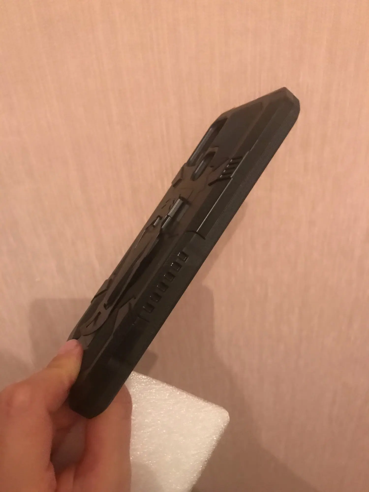 Хороший прочный чехол. Телефон в руке удерживать стало значительно легче. Верх - матовый мягкий, низ - матовый твёрдый. Прищёпка сзади стальная. Очень быстрая доставка, в Калининград за 2 недели.