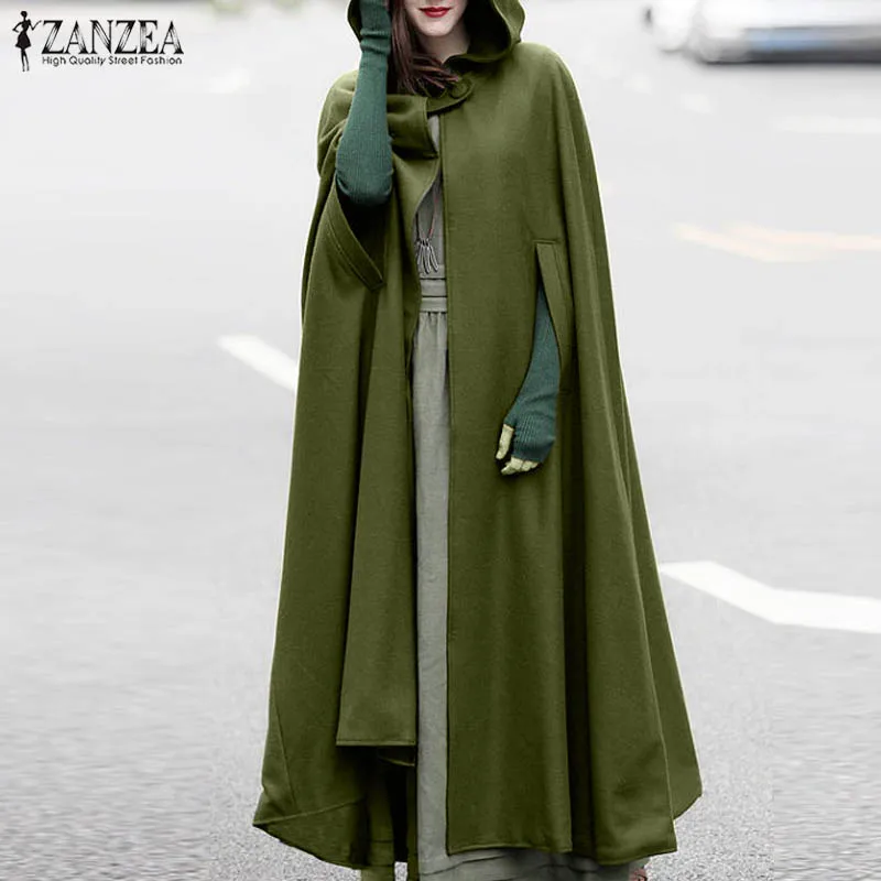 Зимняя однотонная накидка ZANZEA с капюшоном, пальто-пончо, осенняя Женская Длинная накидка, плащ, толстовки, теплые куртки для косплея, верхняя одежда, ветровка
