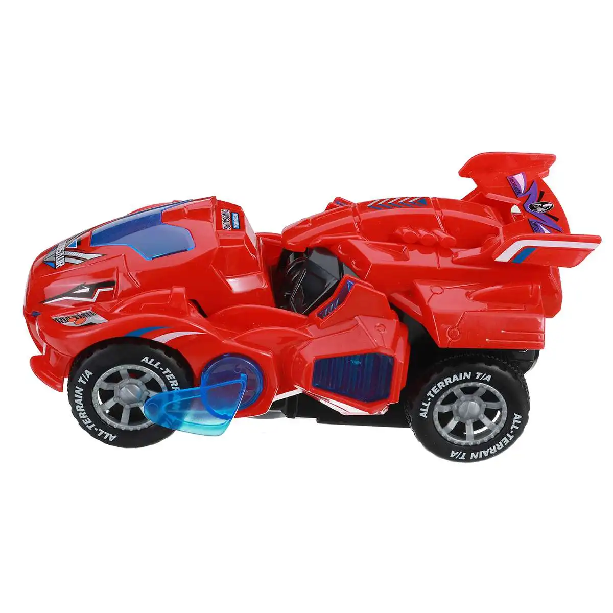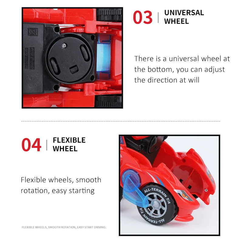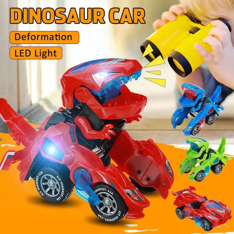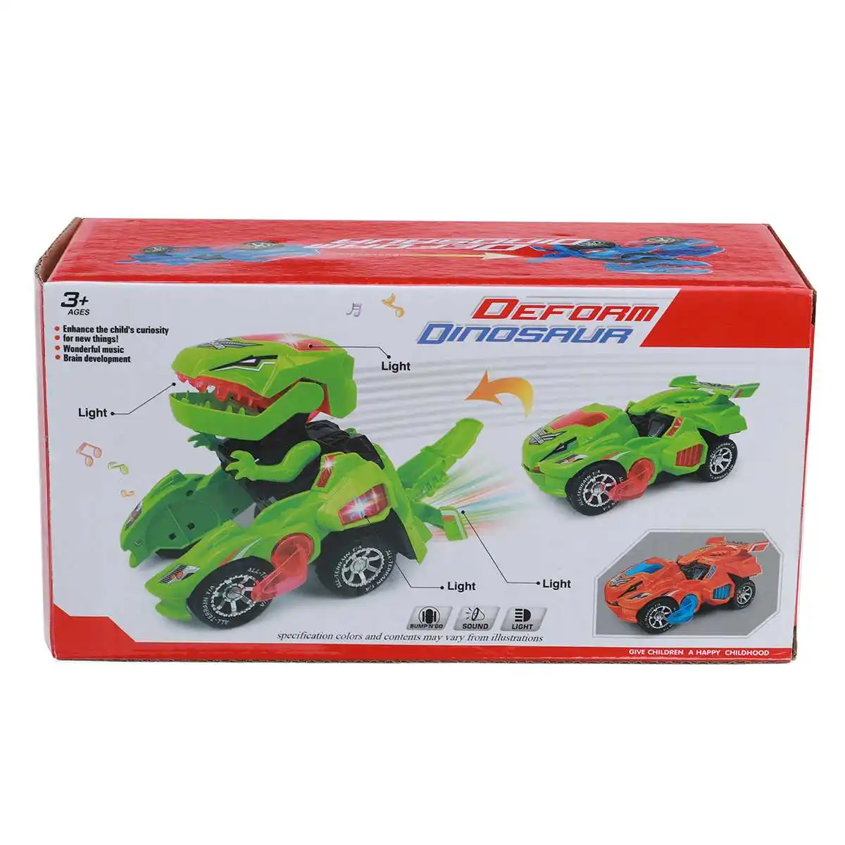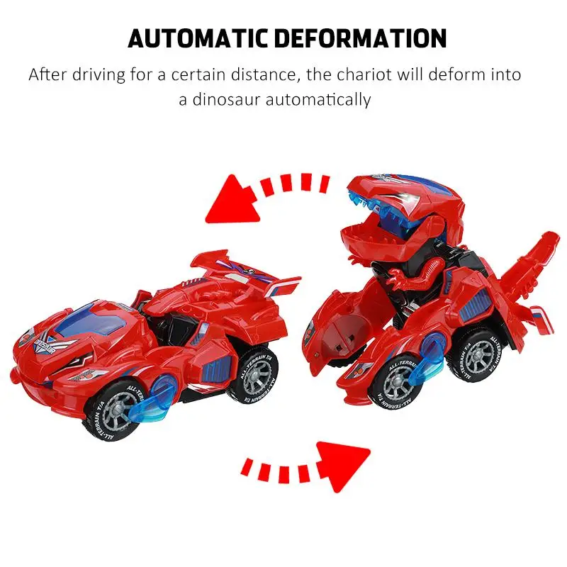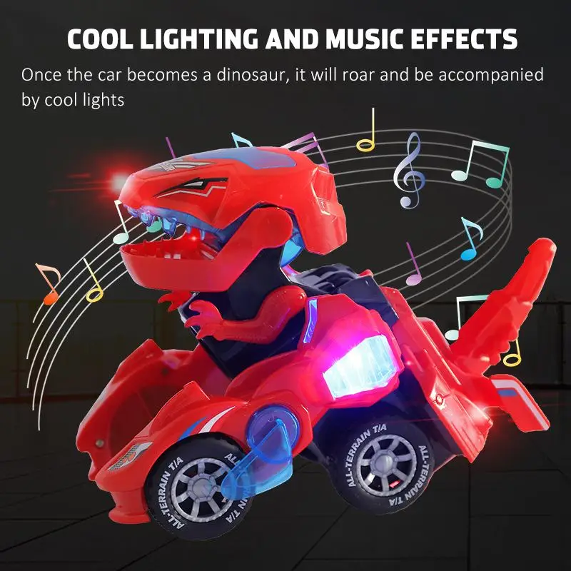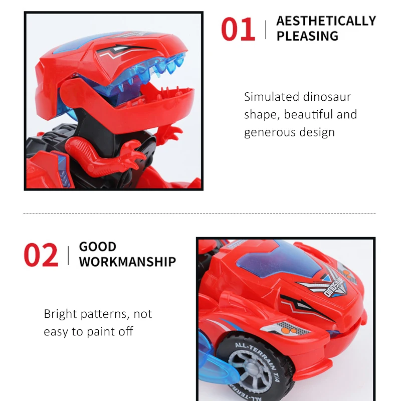 Особенности:-Превращается в динозавра-Когда автомобиль превращается в динозавра, он издаёт громоздкий звук-Светящийся светодиодный свет-Изготовлен из прочного, нетоксичного толстого пластика-Случайный случайный, Веселый музыкальный трек с одним и тем же динозавром с громким звуком